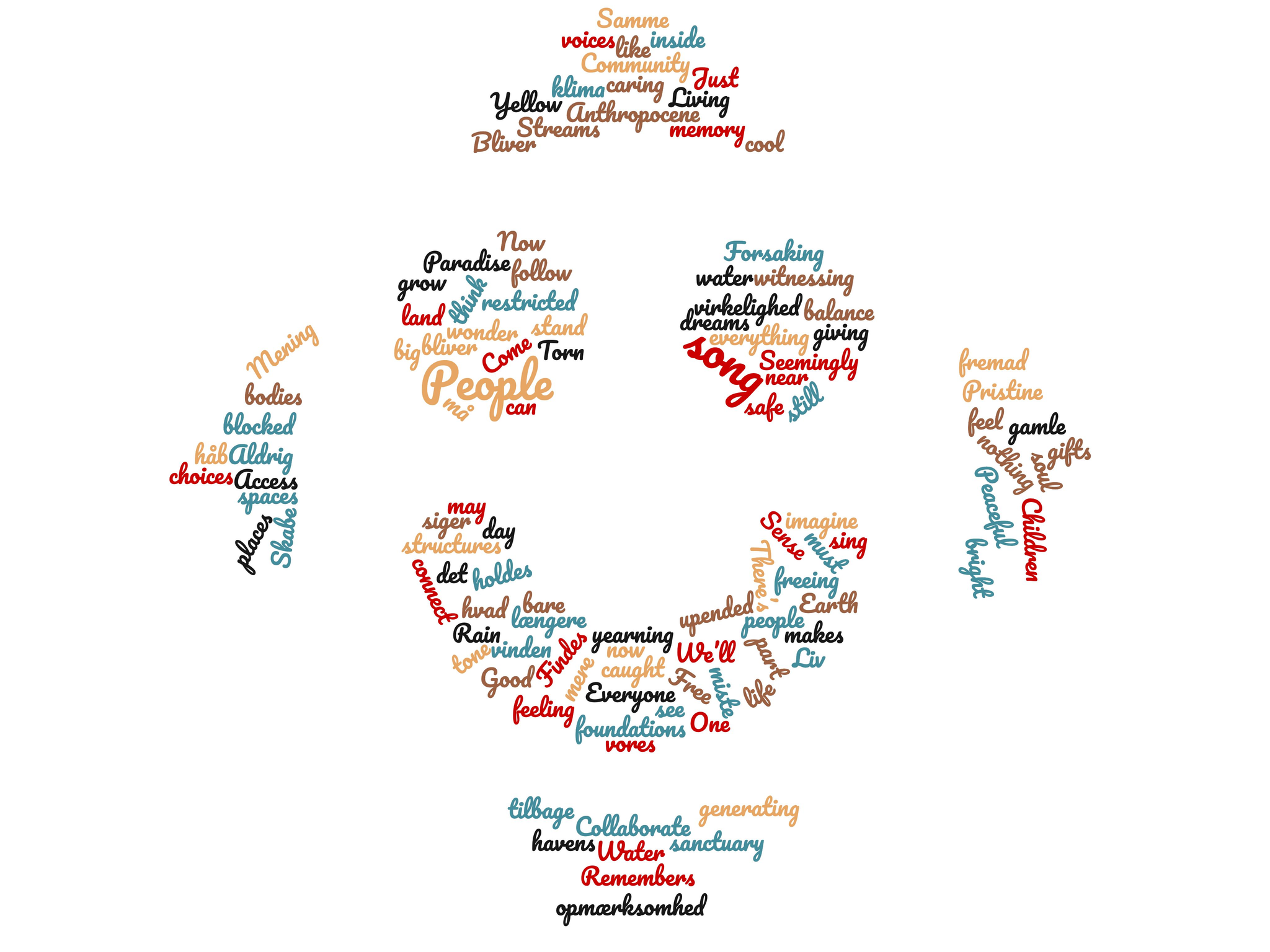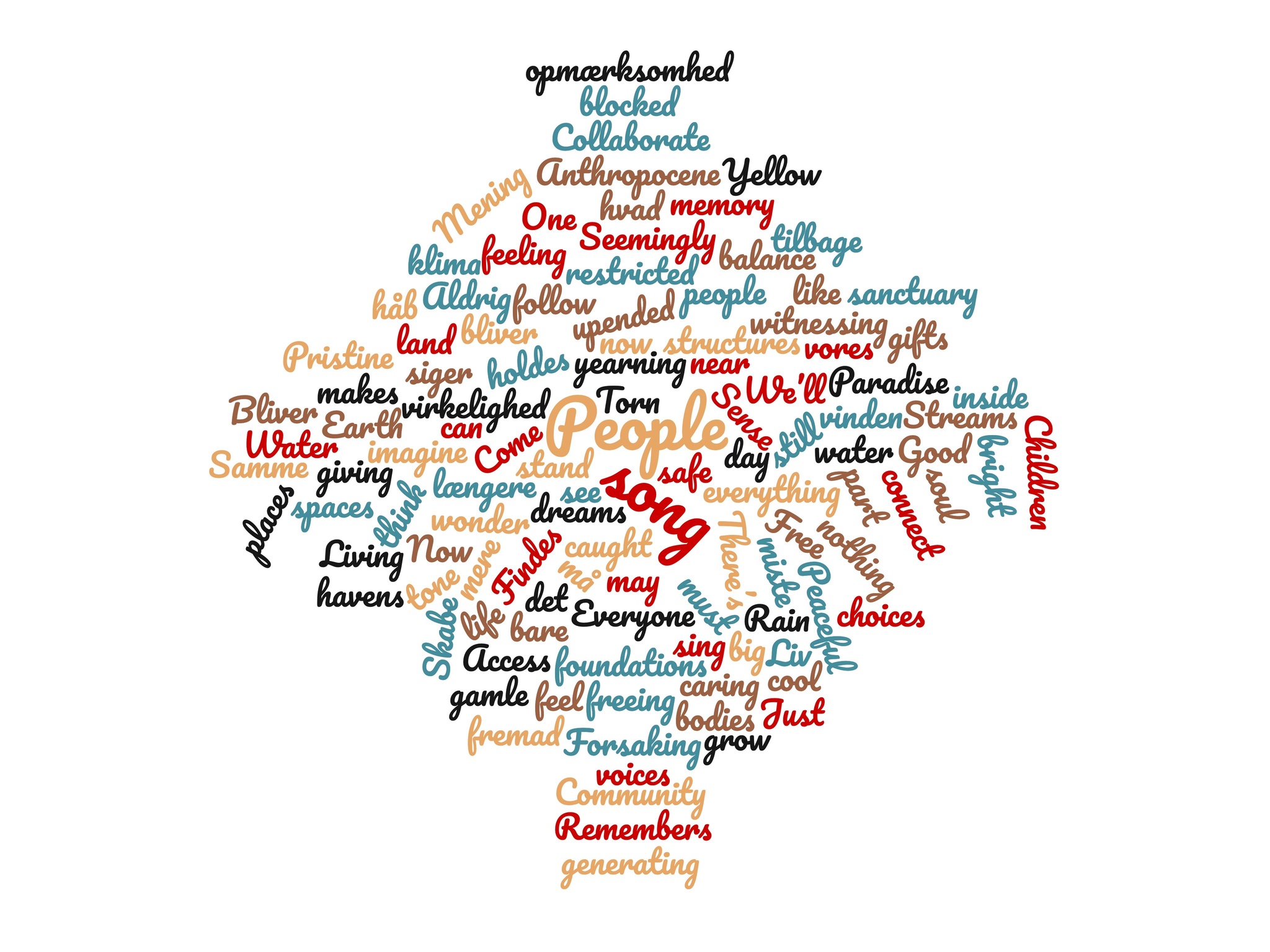 I presented the process and outcome. Alan suggested I keep deferring sense, because the personal and co-written songs of my doctoral project involve how people feel and explore meaning-making processes through songwriting. ‘Song To Open’ would derive from this knowledge but resist organisation into linguistic sense. I had not tried to defer sense in a song before. I had troubled melodic composition in my doctoral work by using a melody game that used dice and play to find melodic strands to work with. But now I was asked to also take a ludic approach to words (to defer logical sense), and I chose to do this through the randomisation of the word cloud generator, not knowing what would come back, but that it should at least have familiar elements.