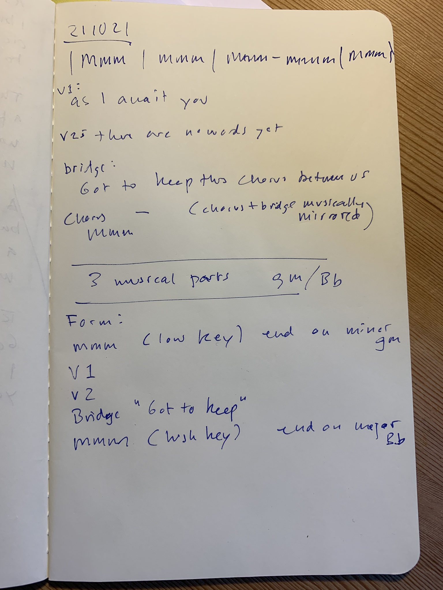This is reflected when I play the song now, several months on. The song does not allow me to revisit a certain feeling or sentiment I was dealing with in the songwriting moment. While it successfully defers logical sense, it also defers a sense of gratification that I as a singer and songwriter am used to navigating towards, and which also helps me curate which songs will make it into a live set or onto an album.