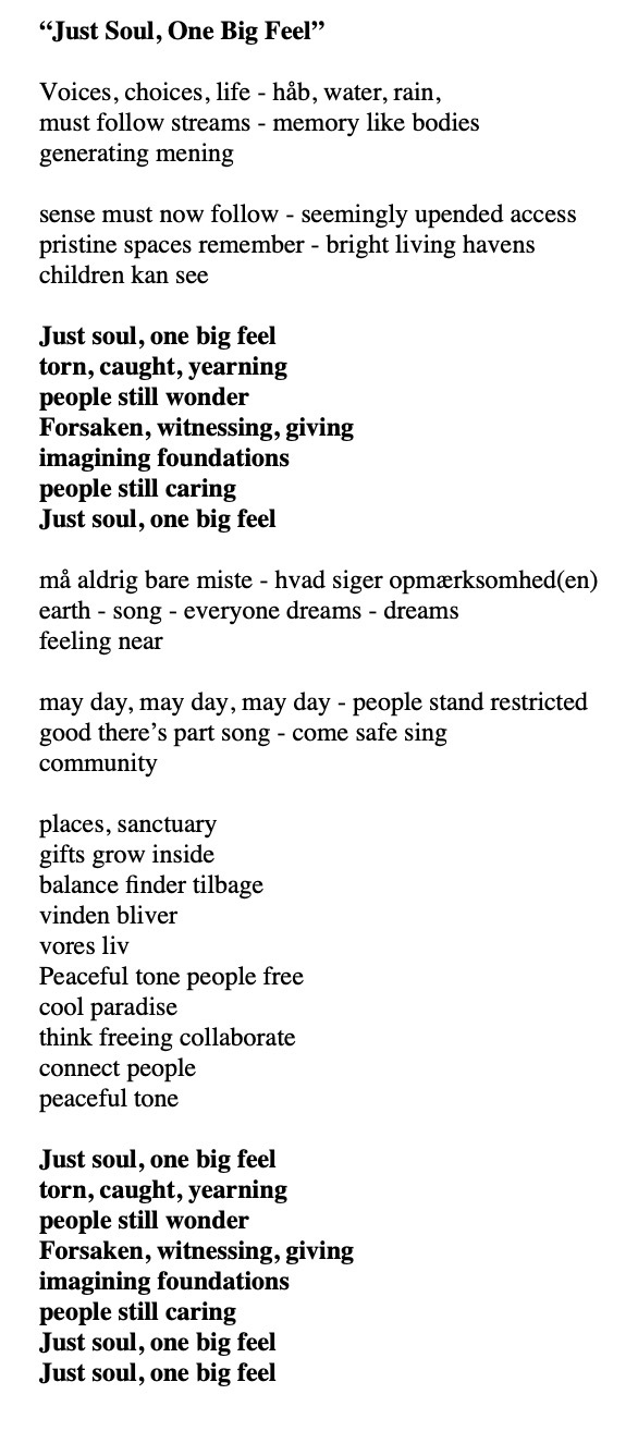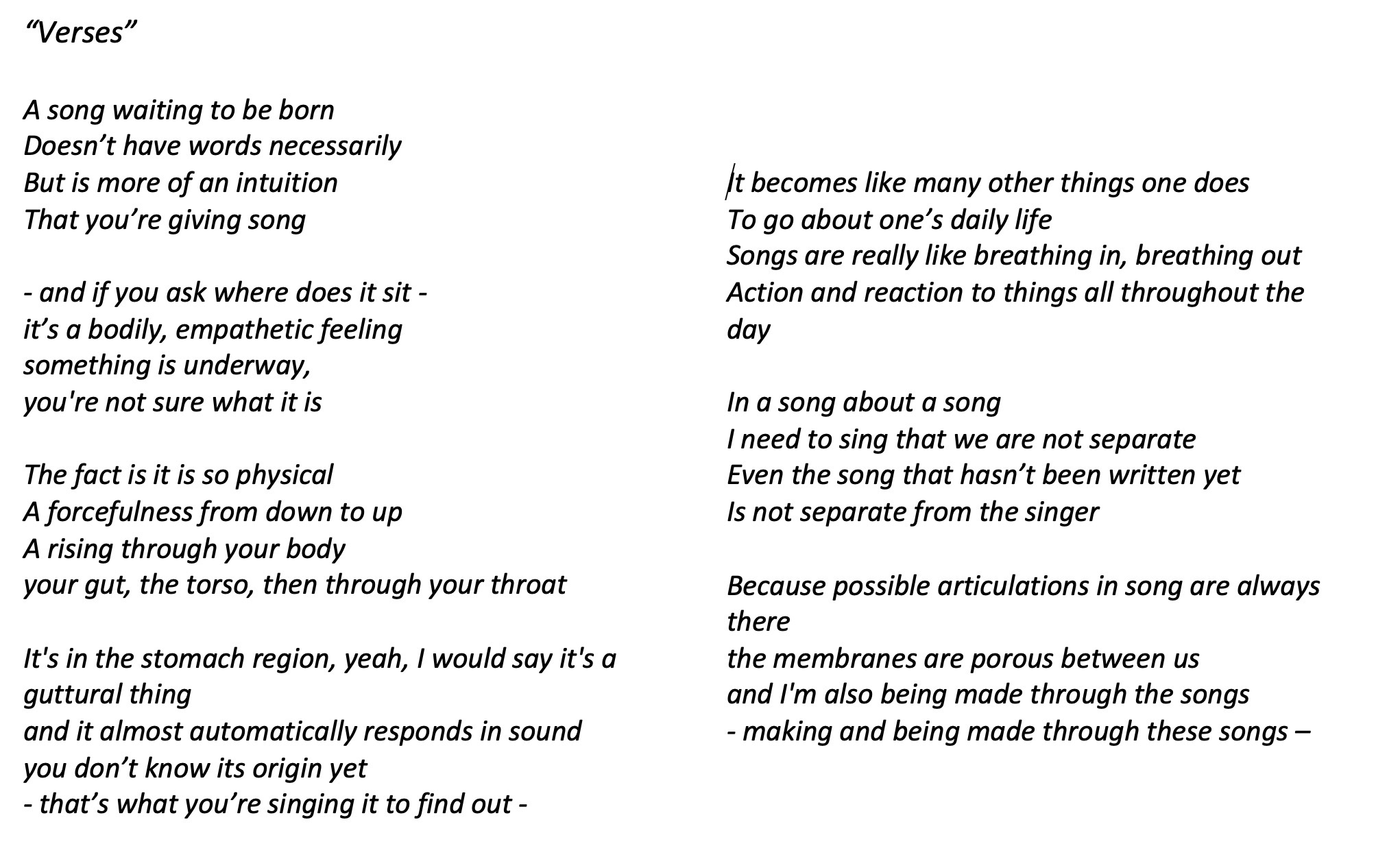 Because sense in ‘Song To Open’ was fleeting, it was difficult for me to feel or find the song’s emotional centre. I would force this process for maker meeting four by re-fragmenting/rewriting the draft. I put the existing fragmented lines together in verse and chorus units, paying attention to emotion but still deferring linguistic sense. I used one fragmented phrase, ‘just soul, one big feel’, as a chorus hook line to express the song’s emotional centre as well as commenting on the inherent sincerity in the songwriting of the source material. The co-written songs in the doctoral project were about different lived experiences, and I wanted this to be expressed in a way that I could feel — making musical and sensuous, if not literal, sense.