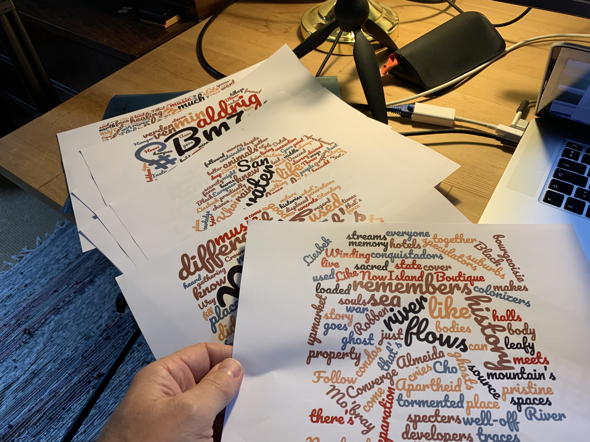 I identified a group of songs from my doctoral project I could envision performing as a live set. To break the sequencing in each song I used a word cloud generator. From separate cloud images of each lyric, I chose two to three words or expressions for each song.