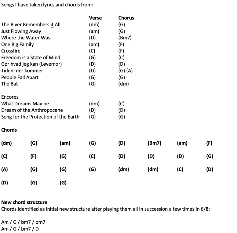 To find chords for the song I took a defining chord from the verse and from the chorus of each of the existing songs, two or three chords per song. I listed them all and played them in sequence to find new chord patterns from the existing material.