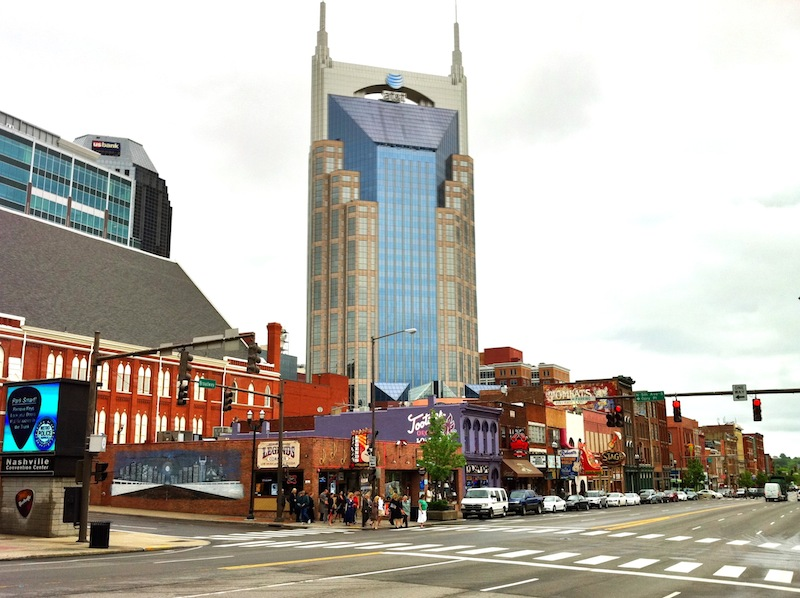 This picture was taken in front of the Bridgestone Arena, home of Nashville’s hockey team. To the left you’ll notice the sign for the Nashville Convention Center, behind which is the renovated red-brick Ryman Auditorium. Lower Broadway and the honky-tonks extend from here down to 2nd Avenue, where the buildings end to the far right. Looming overhead is the AT&T Building (known locally as the Batman Building), a symbol of communication power and corporate prestige. Notice the group of convention attendees walking across the street, just leaving Legends’ mid-day live music offerings.