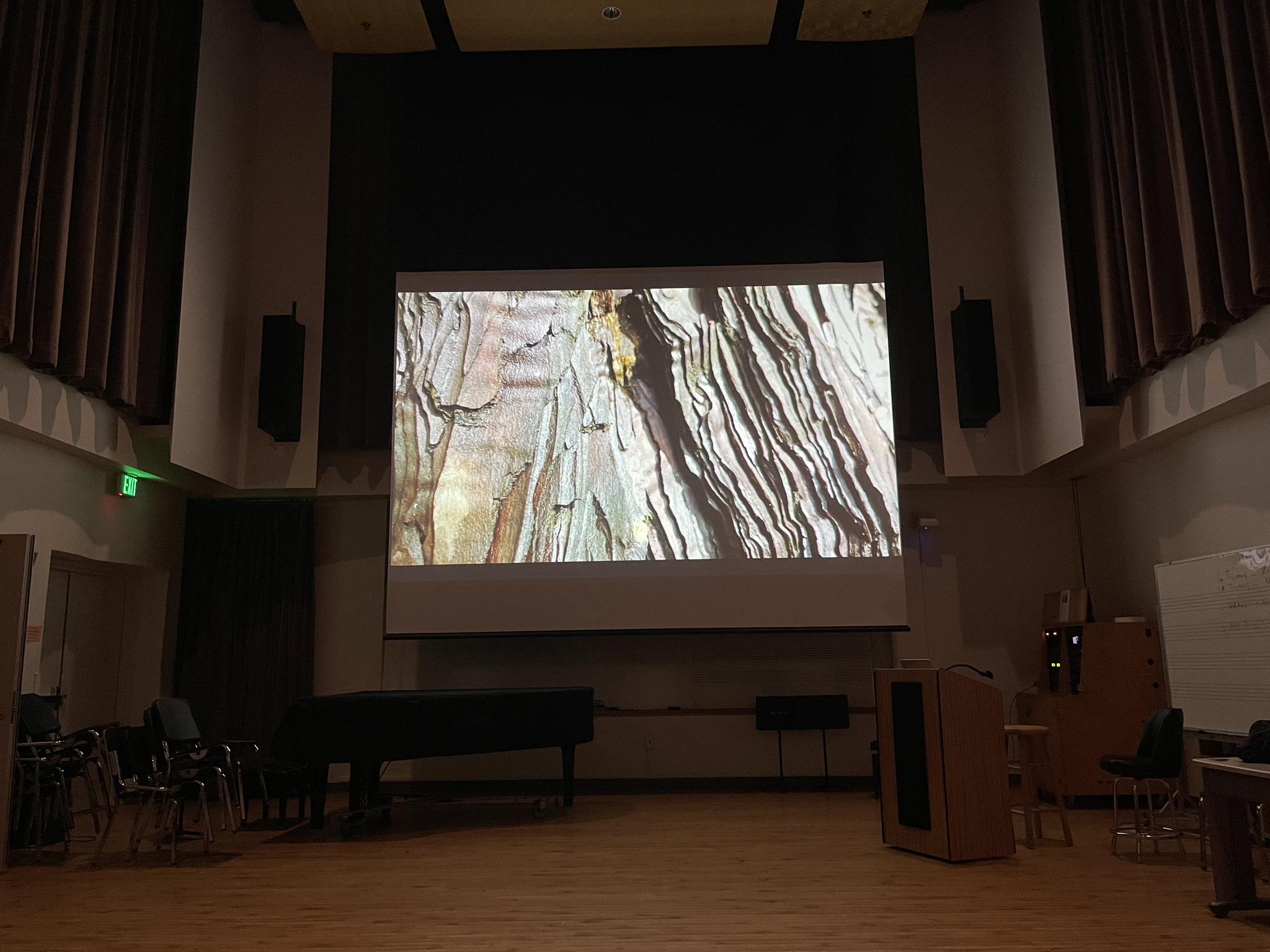 This research has taken me in various directions, wondering if and how we can experience places distant from us by sharing sounds from our local place while hearing sounds from elsewhere. This work has demanded deep introspection through sounds, leading me to abstract concepts of domes of sounds, depth and lift, orientations, emigrations and belonging, all coming together under the title Vertigo and the Sound Portal. Through my artistic research process I've explored techniques of spatial audio and drone video in redwood forests, chased fog along the coast, sculpted a sound portal from branches of a fallen tree, experimented in the studio with sound and video combinations, taken a whale watching trip in dense early morning fog (no whales), taken my electro-acoustic music ensemble on a mycellium sound walk through the forest, explored installation projection techniques and surfaces, always writing words and improvising music. I understand these interconnected ideas as landscapes, and as polyphonies sounding together - as Polyphonic Landscapes.