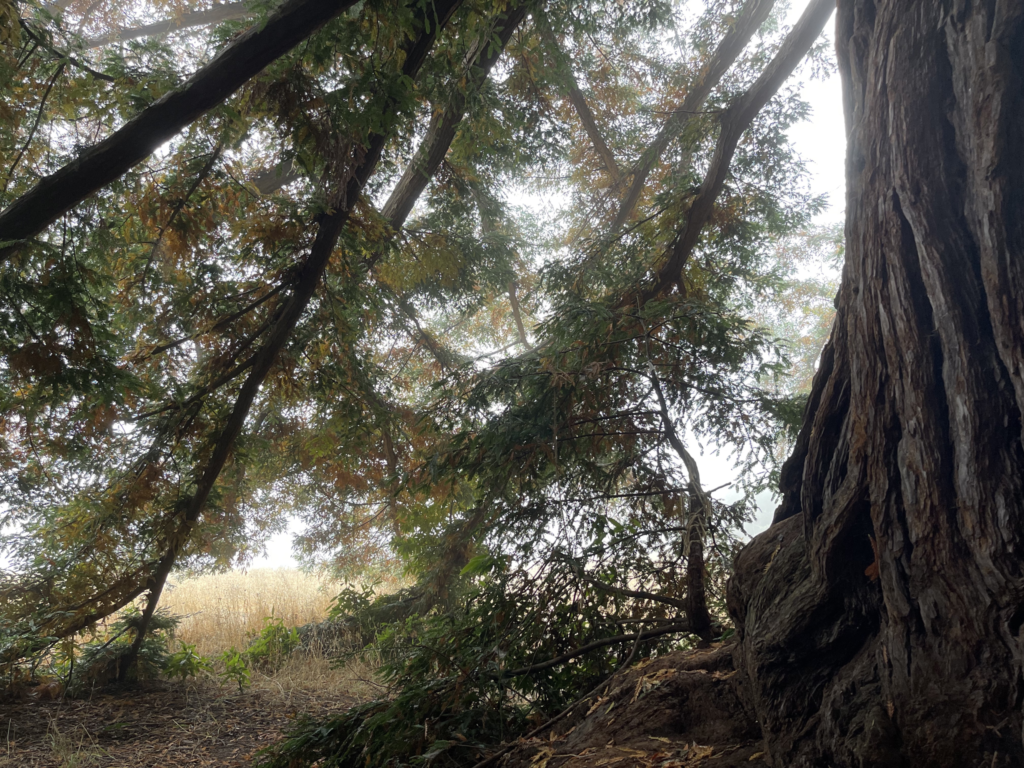 I climb up and up and up above the ocean through yellows, golds and blues swaying with air currents I come to an outcrop of rocks behind which trees have found root and some shelter from the Pacific fog and storms. As I walk around the rocky outcrop, on the uphill side sheltered from the prevailing winds, an opening appears and I see an enormous tree. The thick trunk has bark bulging over the rocks and branches leaning over making a complete canopy. It is a sheltered space within a larger wind space. The sound changes, the temperature, the humidity is noticeably different as are the plant species growing inside. And in the shelter there’s a presence of the trees, of the space they have made, and of a kind of secret that I’ve stumbled on. It’s a moment where I catch my breath and enter slowly, small and a little timid among these giant tree and rock beings. I’m so high up in the air, I’m at the edge of the clouds and fog, higher than many of the birds soaring below me over the wildflower meadows I’ve just passed through. I’m in a different space altogether. And I’m in a kind of sound portal, feeling a little like a guest (wanted? unwanted? I can’t tell).