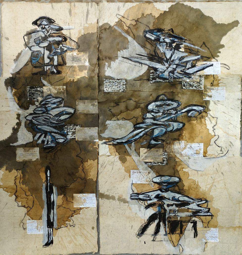 Fig 29: Six family characters on regional maps. Coffee stain, coffee stain, black ink, compressed charcoal, black and white acrylic, index cards, compressed charcoal, on five sheets of handmade paper, 133.5 x 139.5cm © Michael Croft