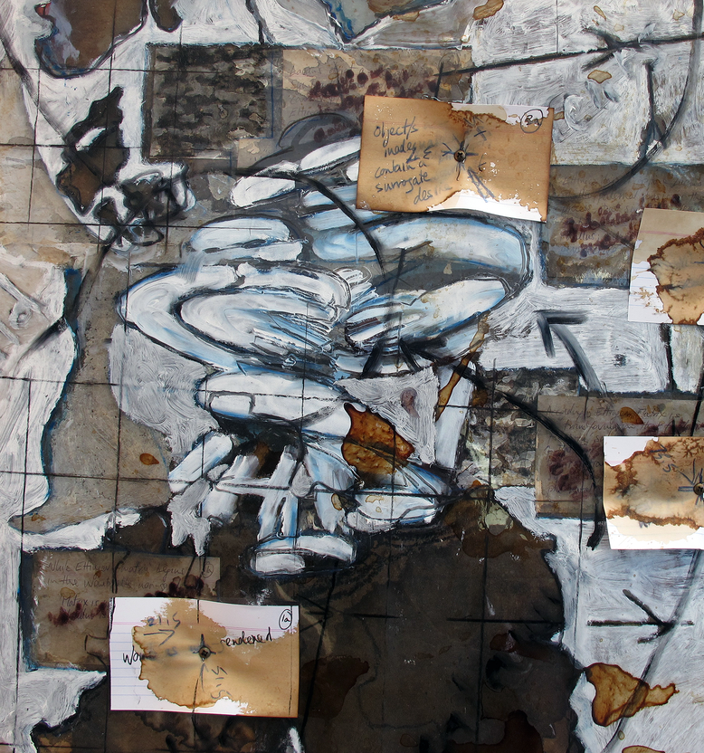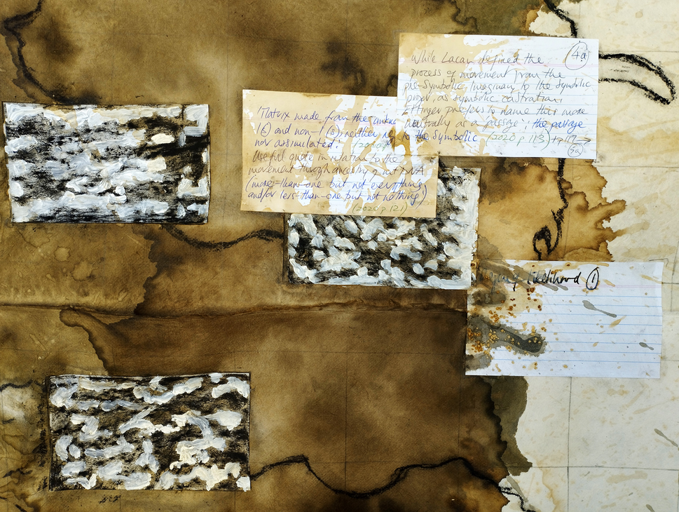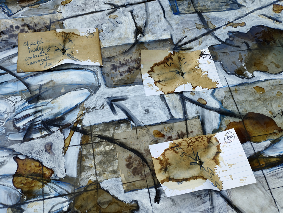 Floated index cards bearing references to Bracha Ettinger on being/becoming glued into their chance positions, and flooded again with liquid coffee (see detail below, Figure 26)