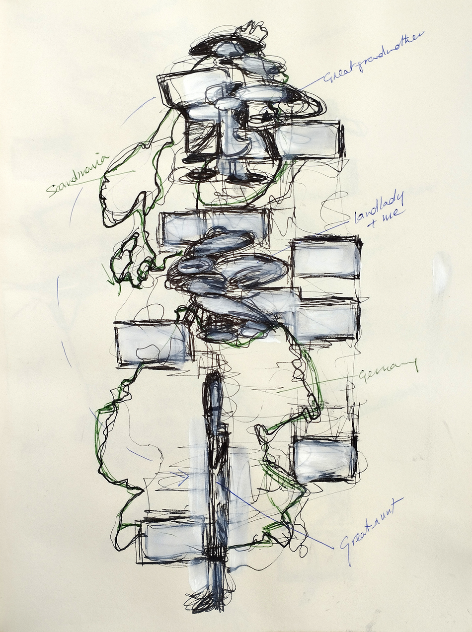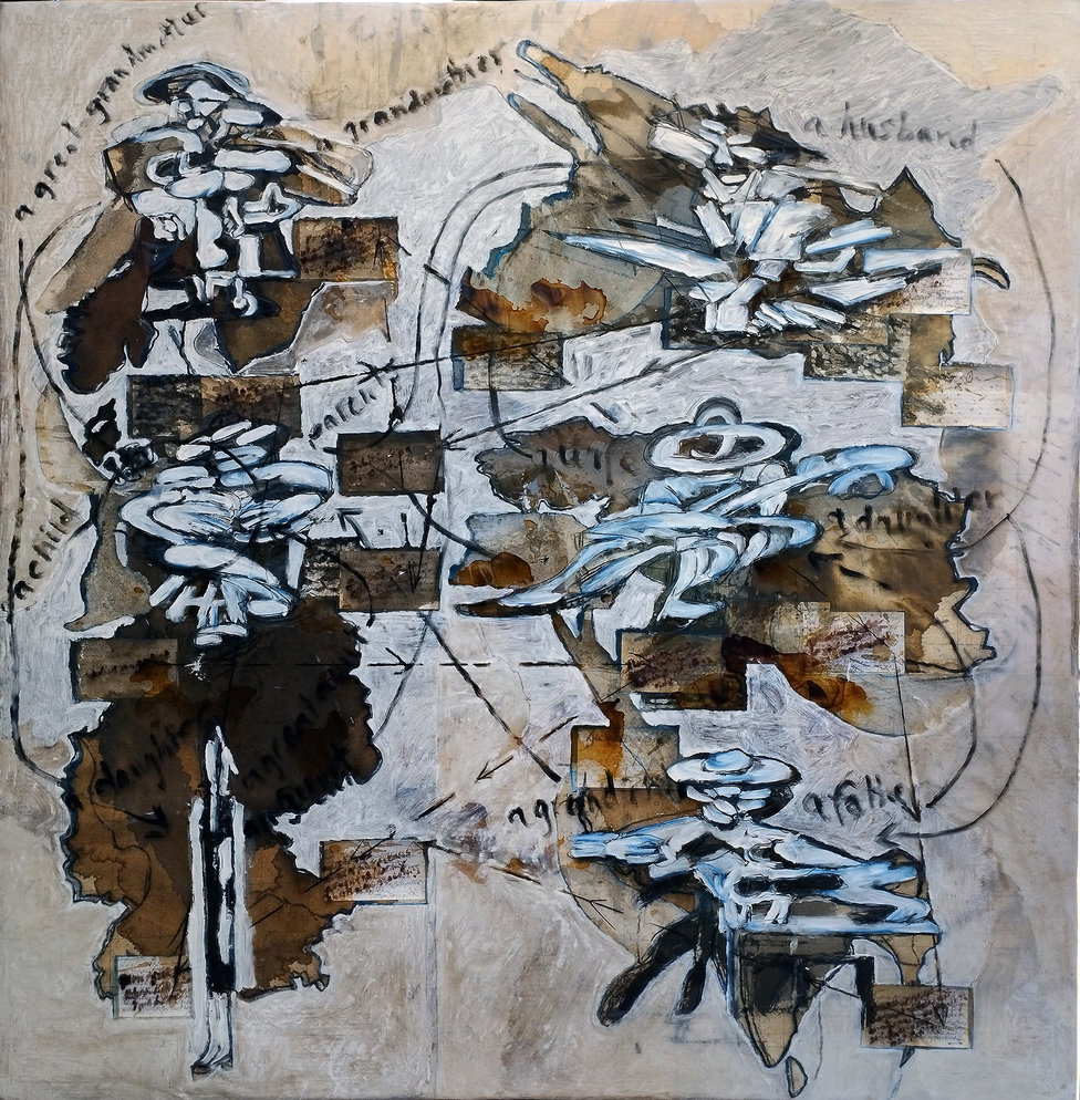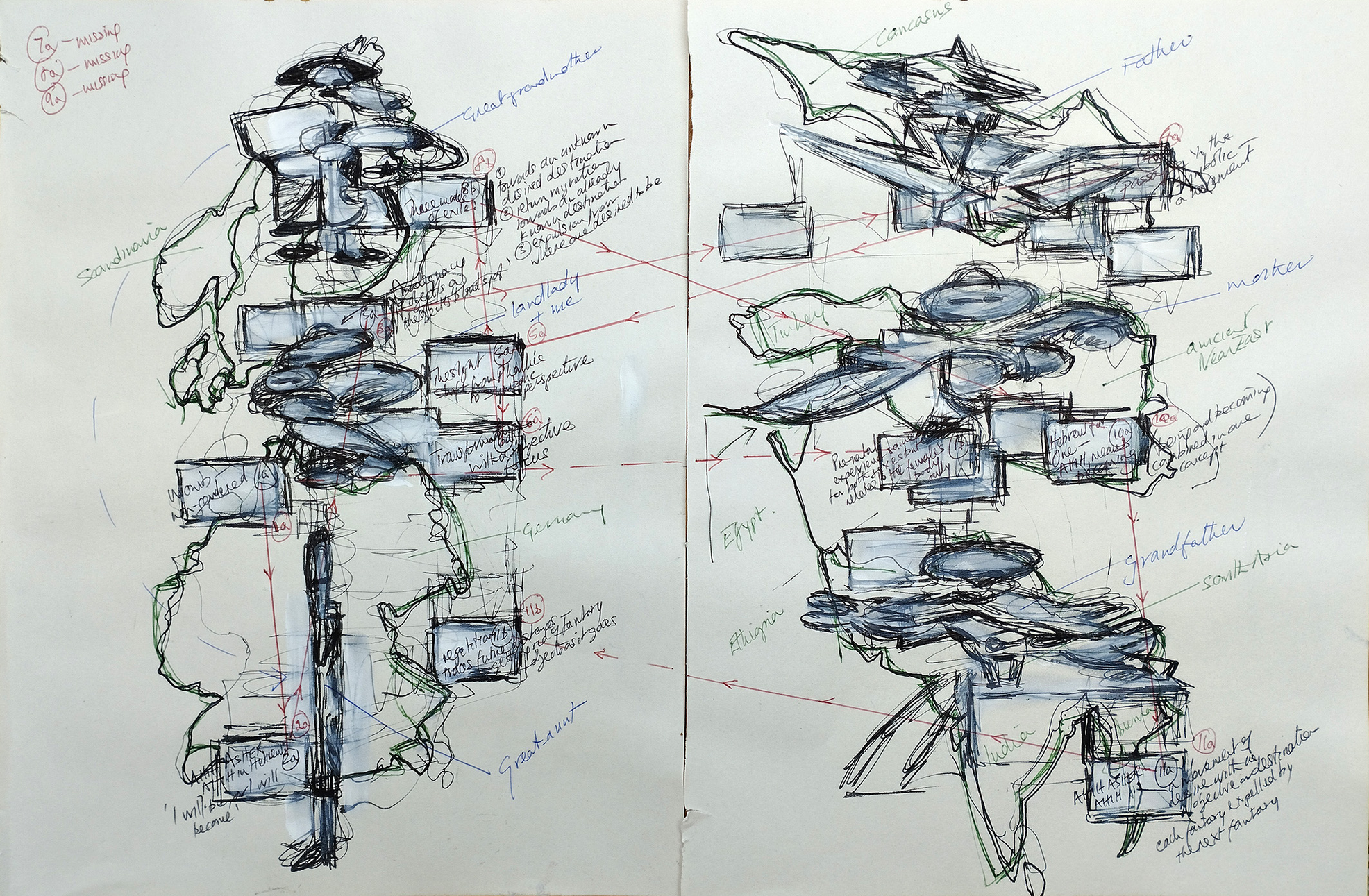 The second drawing is comprised of single-line maps of geographical regions obtained from an ancestral DNA test, coffee-staining, index cards with quotes from the matrixial theory of Bracha Ettinger, six images from the fictional character M.'s adopted family, and the superposition of two matrices, one relating to Ettinger's quotes and the other to how the family members interrelate.
