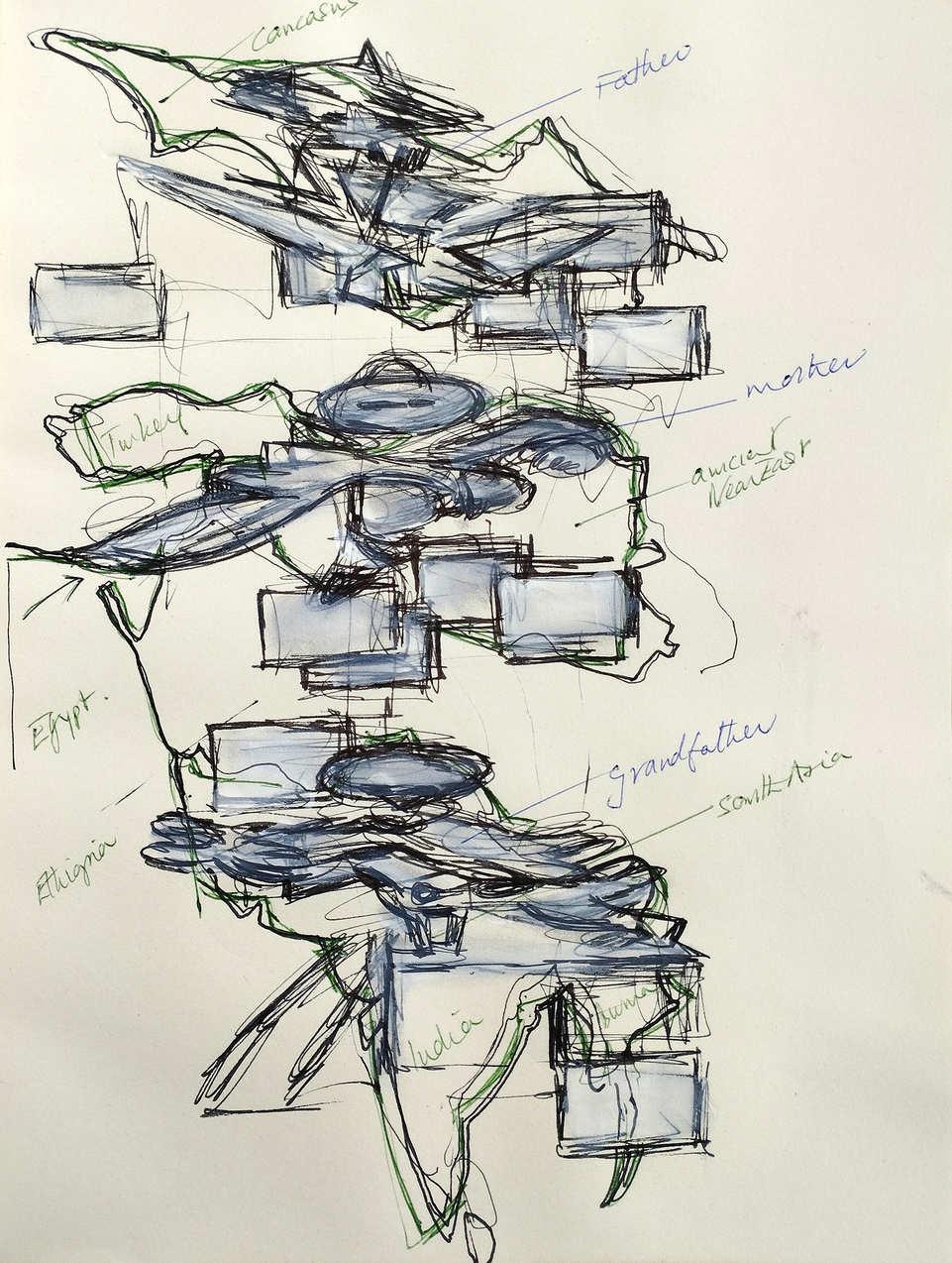 Fig 21: Sketch of Africa and migratory routes of Homo sapiens. Coffee stain, ink, biro, on paper, 29.5 x 20.5 © Michael Croft