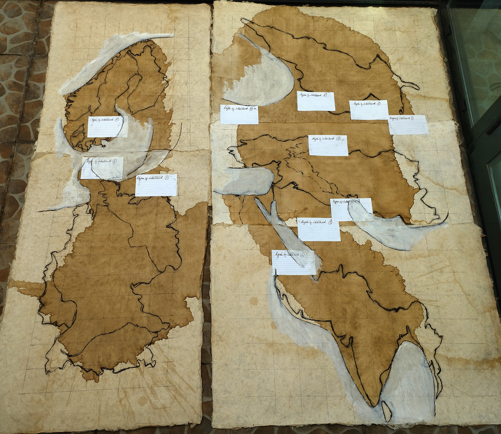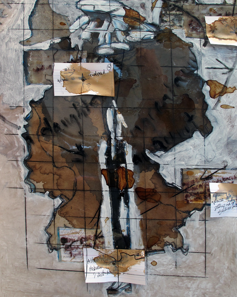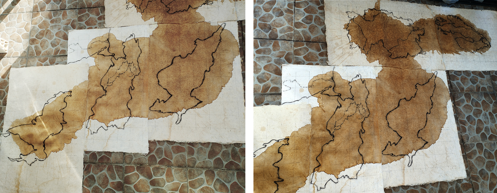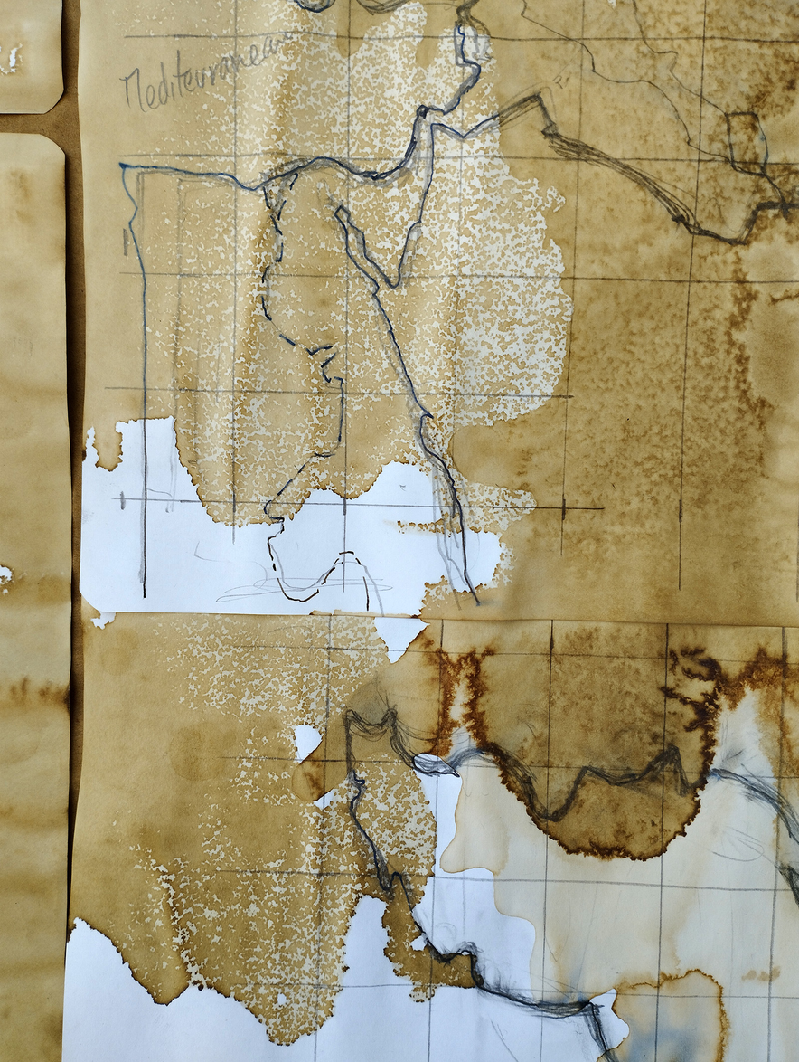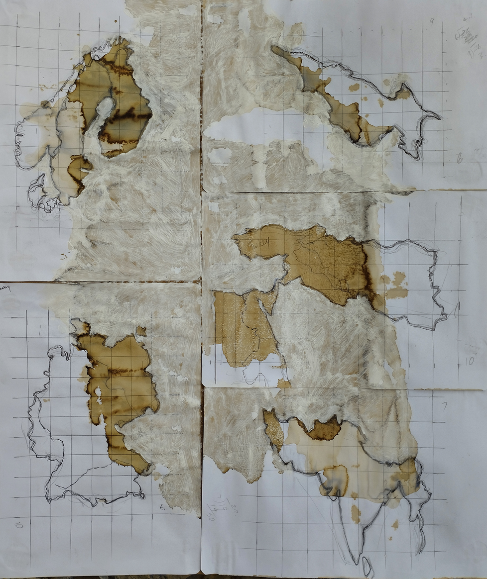 Sketches combined that show maps of Scandinavia, Southern Caucasus, Germany, ancient Near East, and South Asia, subjected to coffee staining and differentiation with surrounding white gesso