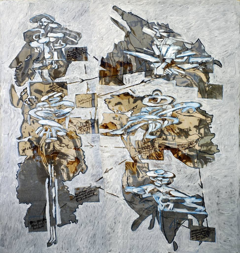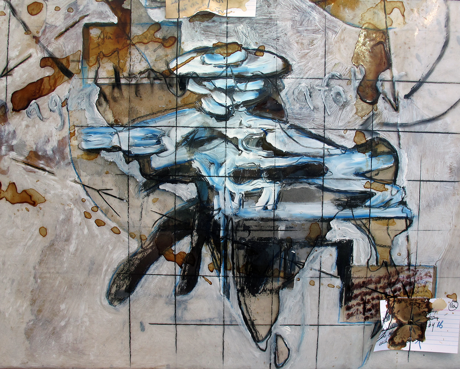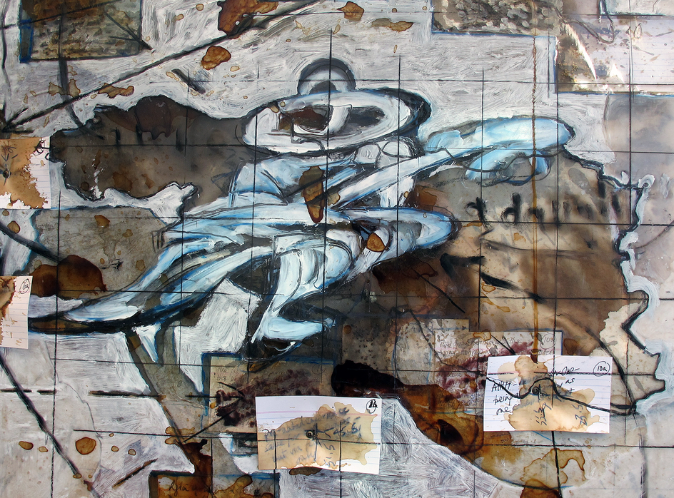 Fig 33: Matrix, first state. Coffee stains, blue Dermatograph pencil, index cards, compressed charcoal, handmade paper, on underside of clear plastic sheet, blue dermatograph- and black Dermatograph pencil, oil paint on overside of clear plastic sheet 133.5 x 139.5cm © Michael Croft