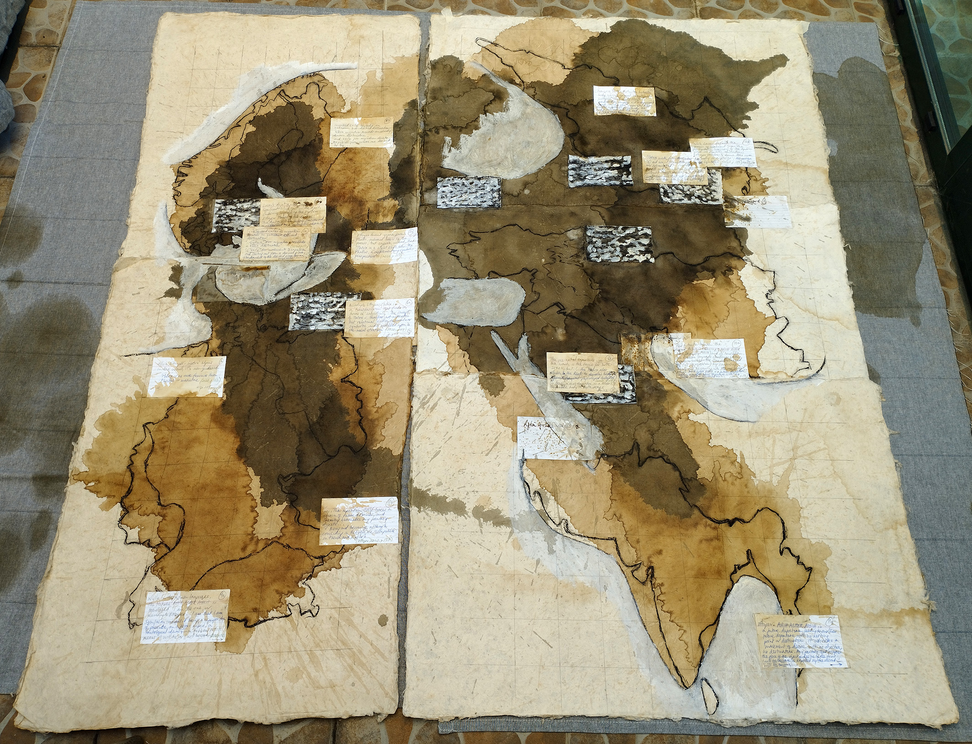 Beginnings of work, 'Expanded She/Her', showing maps of Scandinavian, Germany, Southern Caucasus, Ancient Near East, and South Asia, copied onto handmade paper with compressed charcoal and impregnated with liquid coffee, Figure 23