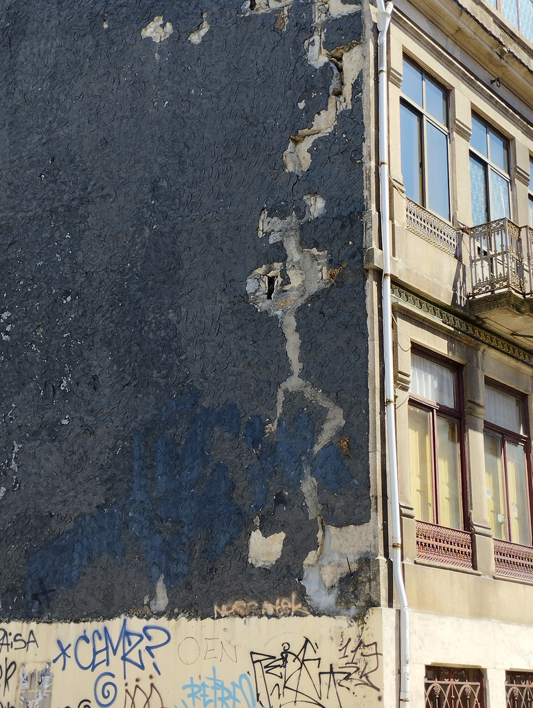 Distressed wall reference, Porto, Portugal, mainly due to the associative anthropomorphic imagery that emerges out of the extractions of the bitumen cladding