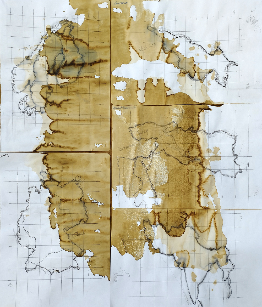 Fig 23: Line regional maps. Coffee stain, compressed charcoal, on five sheets of handmade paper, each sheet 77 x 55cm © Michael Croft