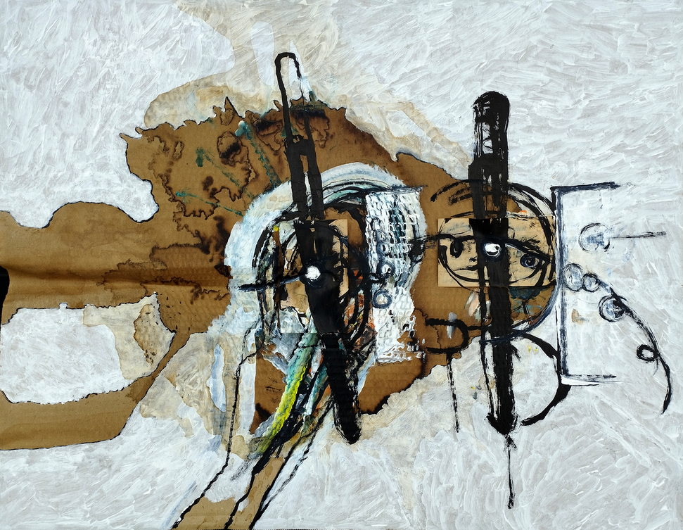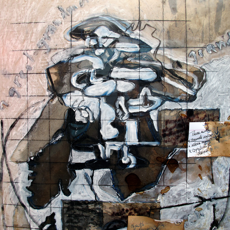 Fig 45: I will be... Coffee stain, white gesso, screws, index cards, acrylic paint, ink, on corrugated cardboard, 71 x 58cm © Michael Croft