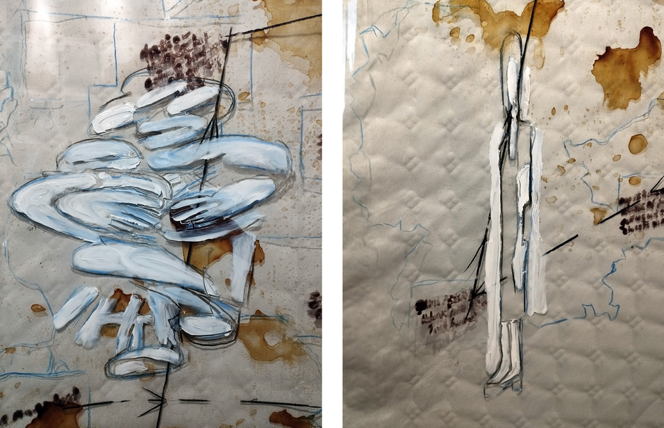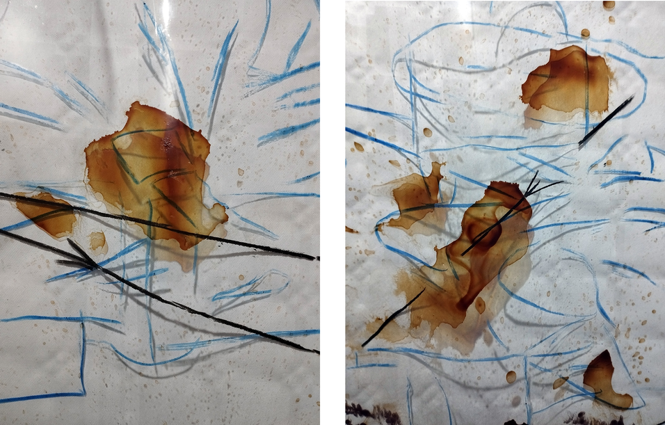 Figure 32: Details of Fig 33, below. Coffee stains on underside of clear plastic sheet, blue Dermatograph- and black Dermatograph pencil on overside of clear plastic sheet, variable dimensions © Michael Croft