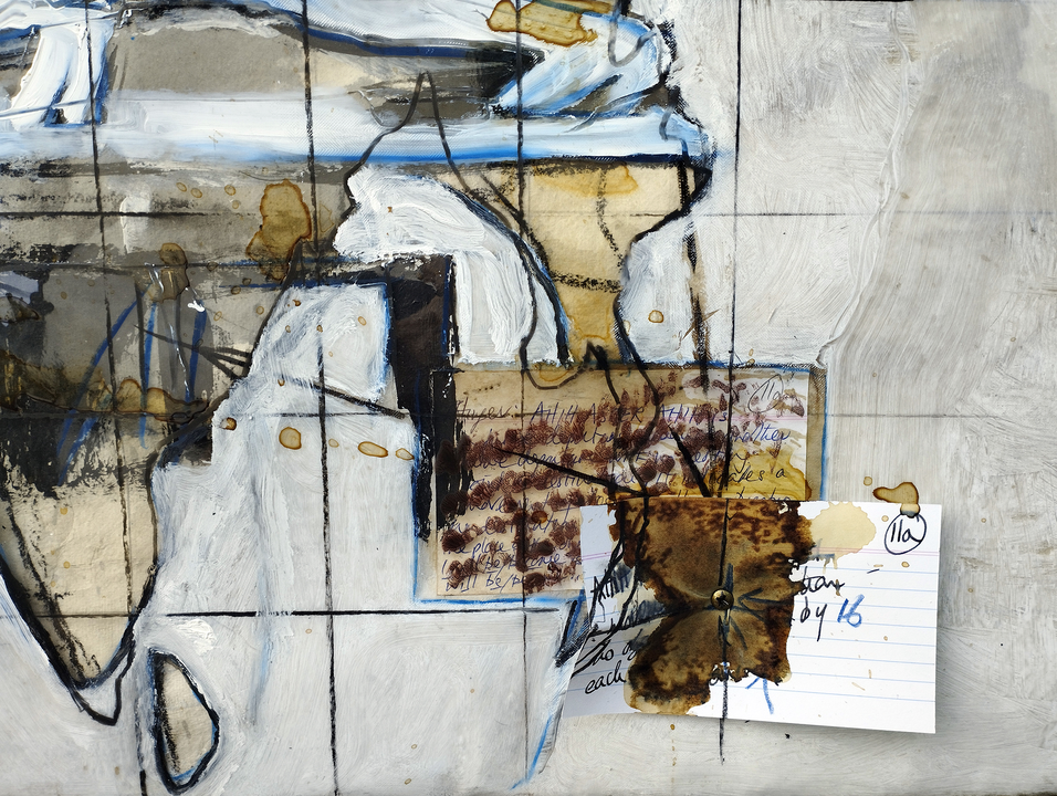 Finally, the index cards were integrated with the colour and textures behind the overlay by being tracked with poured coffee. The excess non-absorbed coffee has dried in rivulets: details Figure 35a/b; completed work Figure 36.