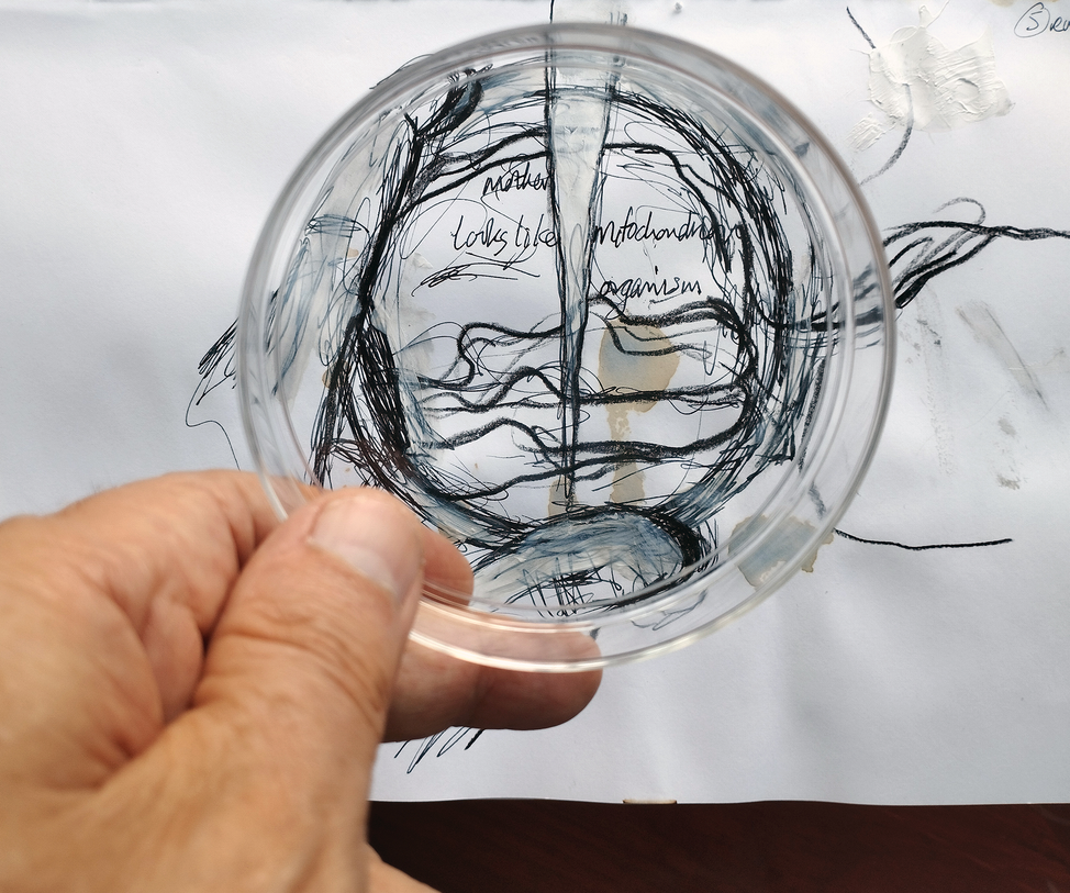 The idea of ranging a Petri dish over what had been conceived as cell clusters in the project, (see Ancestry – before DNA test – considered through Drawing) has by now become a key motif. Under this cell cluster in particular is the name mother, the phrase looks like mitochondrion, and the word organism.