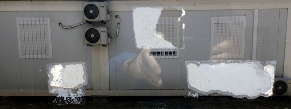 Precedent image of remains of posters torn from a window, seen against an offices backdrop and reflecting hands of photographer