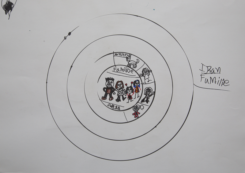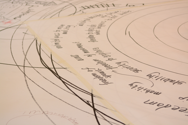 ‘What is really interesting about the camp cosmology we made is that whereas in the original ones for the UK system there is a maze of bureaucracy and institutions, in the freedom cosmology everything stays in the first circles, and there are a lot of voids. And you can see that’s because basic human needs have been denied.