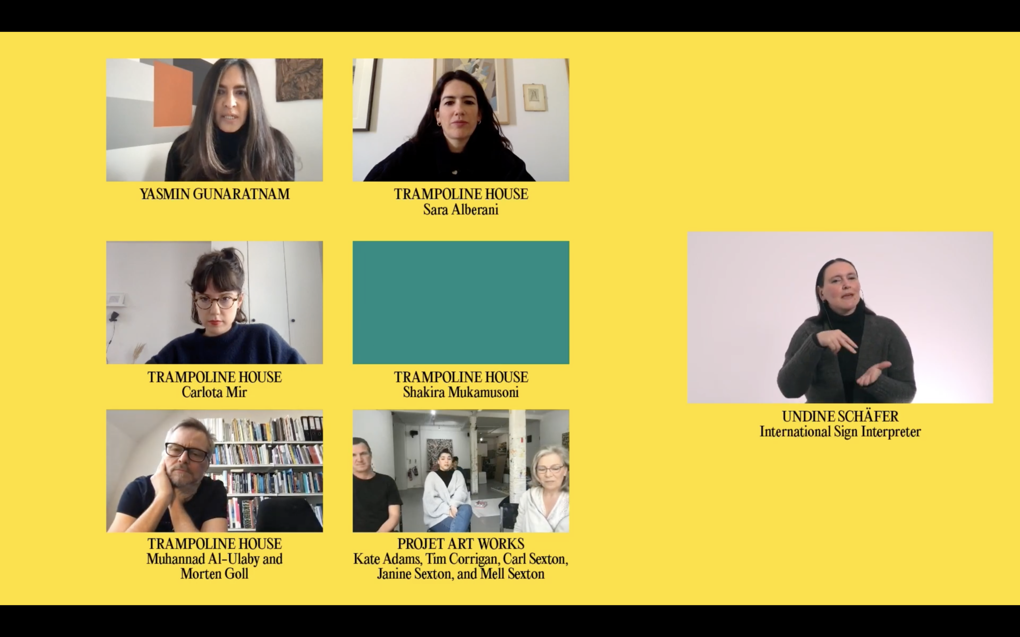 After a lot of informal dialogue among us, we were able to compare our practices, local contexts and the struggles of our communities in a public speaking session entitled ‘Navigating Systems of Care and Control’, which took place online in April 2022. This conversation between Trampoline House and Project Art Works was part of Lumbung Konteks, an online public programme within documenta fifteen. Conceived as a monthly conversation series between pairs of lumbung members in the period leading up to the exhibition, this initiative from the documenta Artistic Team sought to create dialogues among the different collectives, drawing common threads in our practice that reflected on shared lumbung values. In the case of Trampoline House and Project Art Works, we already had a clear sense of what our common ground was, and we seized the public programme as an opportunity to share our artistic practices, concerns and political agendas, laying the groundwork for the collaboration that was to come.