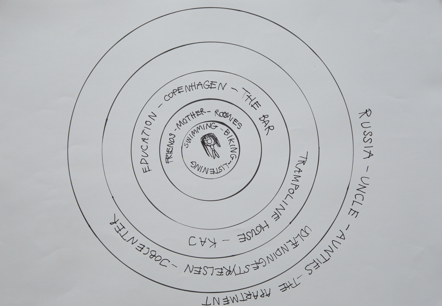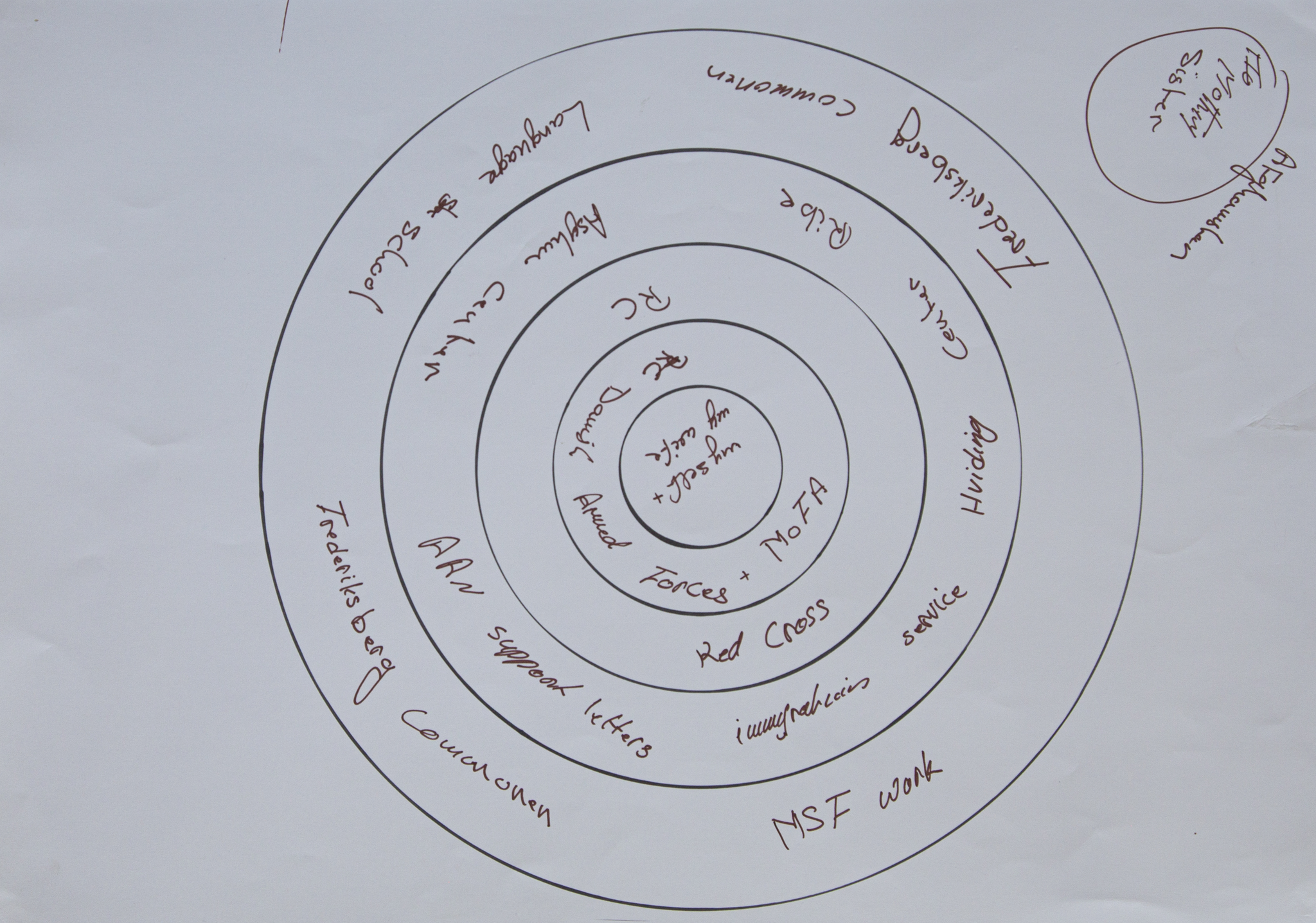 Inspired by these drawings, our collaboration departed from the realisation that there were evident parallels between the complex systems of care and control that administer both communities: as it first occurred to us during our first in-person encounter at Project Art Works’ Turner Prize exhibition in November 2021 (Circle II), the cosmologies could be useful to make visible the lives of refugee communities and the complexities of the asylum system in Denmark, and to reclaim agency and change within it. Translating the cosmologies into the context of asylum underlined their worth as an endlessly adaptable practice that puts people in the centre, helps raise self awareness, makes visible infrastructures, trauma and desires, and articulates individual thoughts and feelings as part of larger systems and collective constellations.