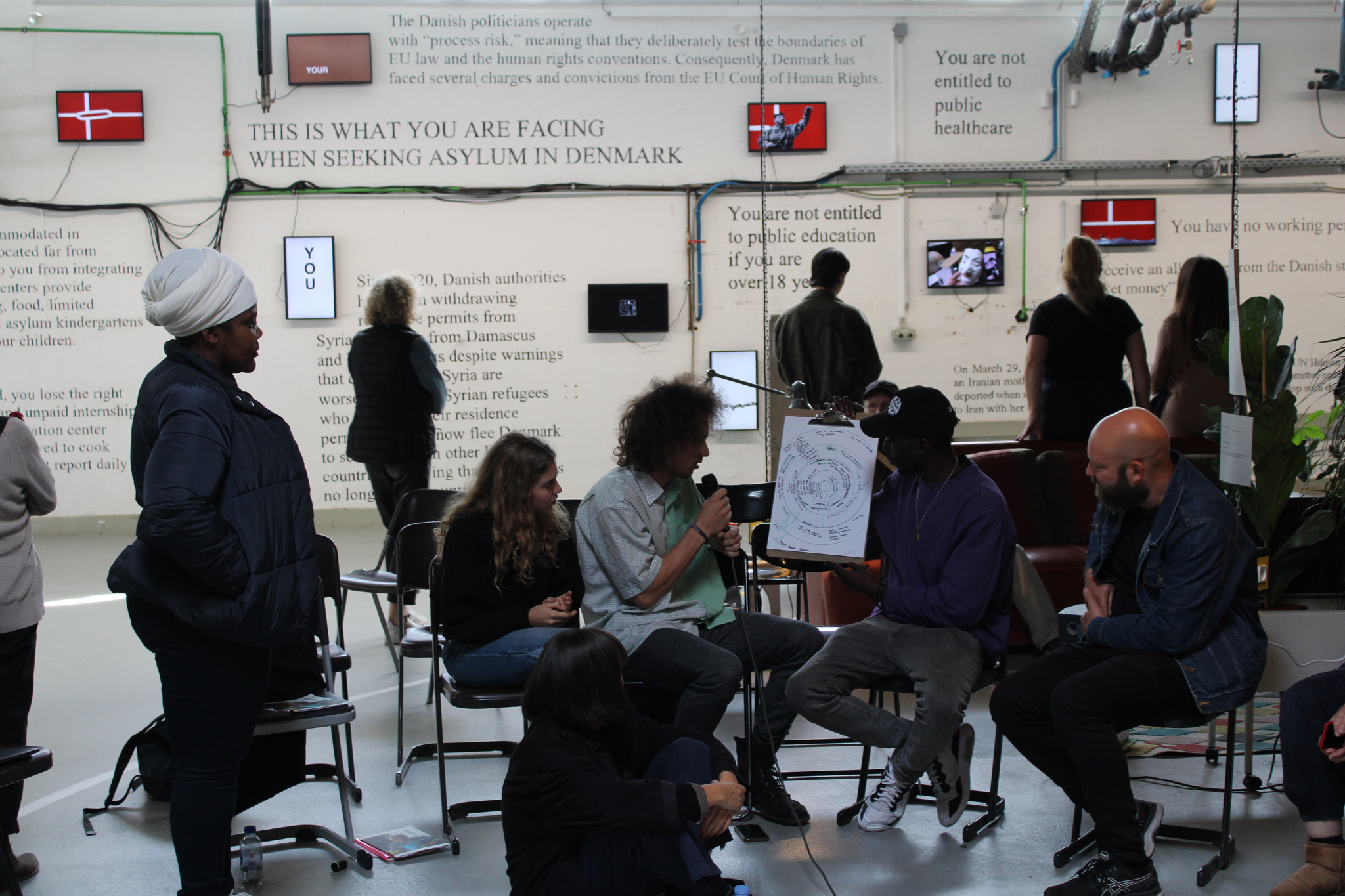 On the outside: a wall, reading - THIS IS WHAT YOU FACE WHEN SEEKING ASYLUM IN DENMARK - listed an endless trail of dehumanising protocols by the Danish government, while the combination of space and artworks - film and sound pieces, animation, a visit book where visitors could write and share their thoughts and feelings, zines, a fashion collection, masks, protest signs - invited the viewer to walk around, sit down, read and watch TV and come into contact and direct empathy with the reality of Danish - and by extension European - migration policies and their impact on people’s dignity. Making visible the fact that our wider community could not be physically present in Kassel because of their legal status, our Artistic Team, made up of 14 people with mixed refugee and non-refugee backgrounds, put together a programme for the 100 days. We chose to focus on very different site activations: a fashion show, public talks, poetry readings, public drawing sessions and performances on the migrant question and its political and ethical underpinnings, always placing migrant and refugee knowledge, embodiment and experience at the centre, referring back to the House for feedback and inviting what we call ‘deprogramming’ - a collective questioning of one’s own assumptions, privileges and positions through shared vulnerability and affect in the space of the House, whose spirit we had aimed to translate into our living room at Hübner.