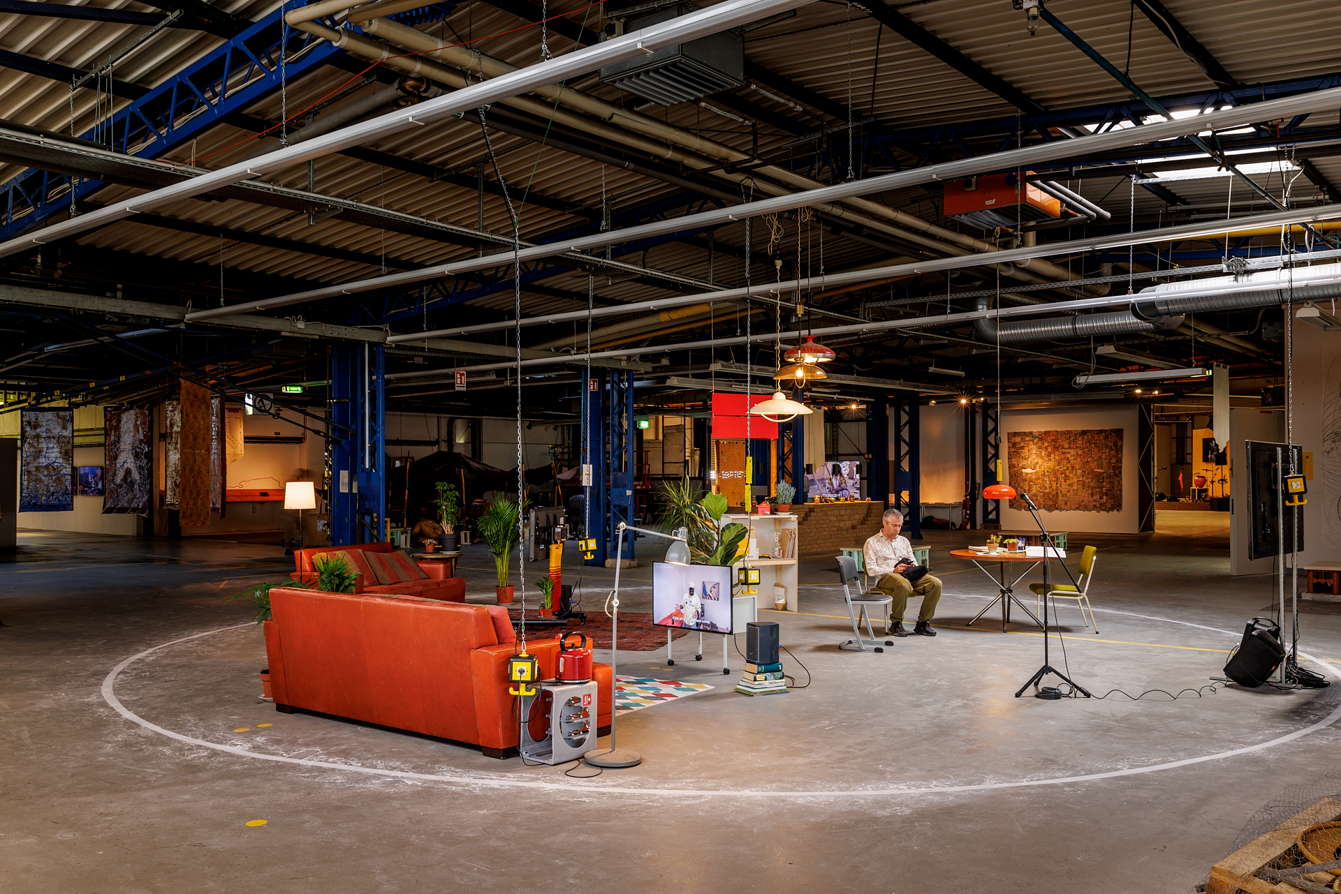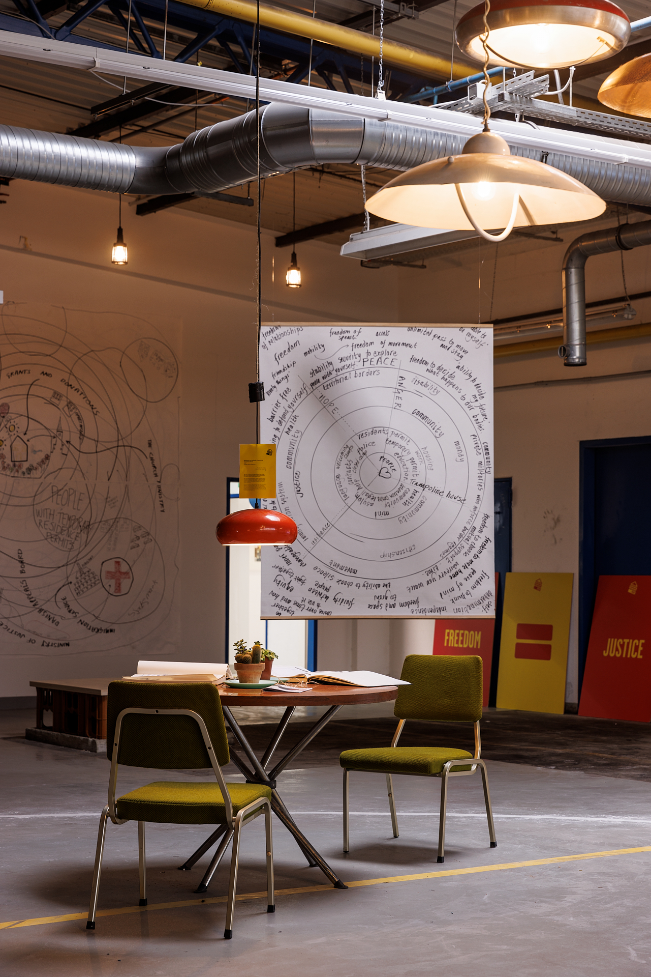 Located in the Hübner building, Trampoline House’s Castle in Kassel consisted of a cosy, Scandinavian-style living room set up inside a chalk circle - a weak, imaginary construction that demarcated the house as a protected space, decidedly yet precariously shielding people from the hostility facing migrants in Denmark.