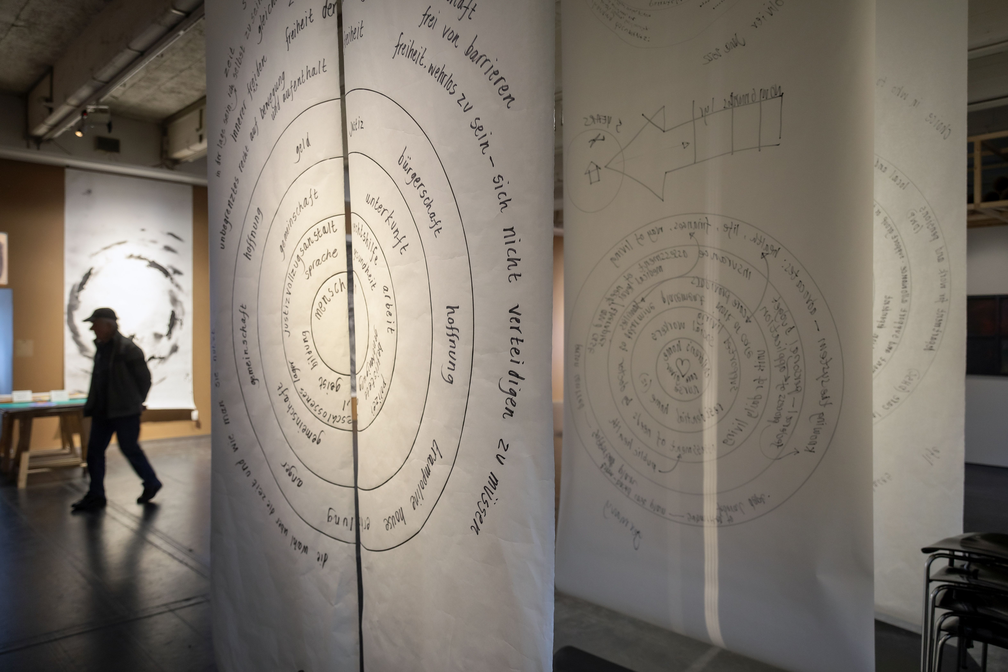 As for the cosmologies, which explored a different system to that of disability in the UK for the first time, the collaboration between Trampoline House and Project Art Works guided the public process of cosmology making during the 100 days of documenta, and it worked as a way to meaningfully broaden the topics explored by Project Art Works in Kassel. To mark the significance of our collaboration, symbolise translation into the local context of Kassel and pave the way for a process of public cosmology drawing sessions during the 100 days, a German translation of the Freedom cosmology was made and hung at the entrance of Project Art Works’ space in Fridericianum. As Kate Adams reflects in her letter exchange with Carlota Mir and Sara Alberani, which is published in full in our harvest for visAvis: