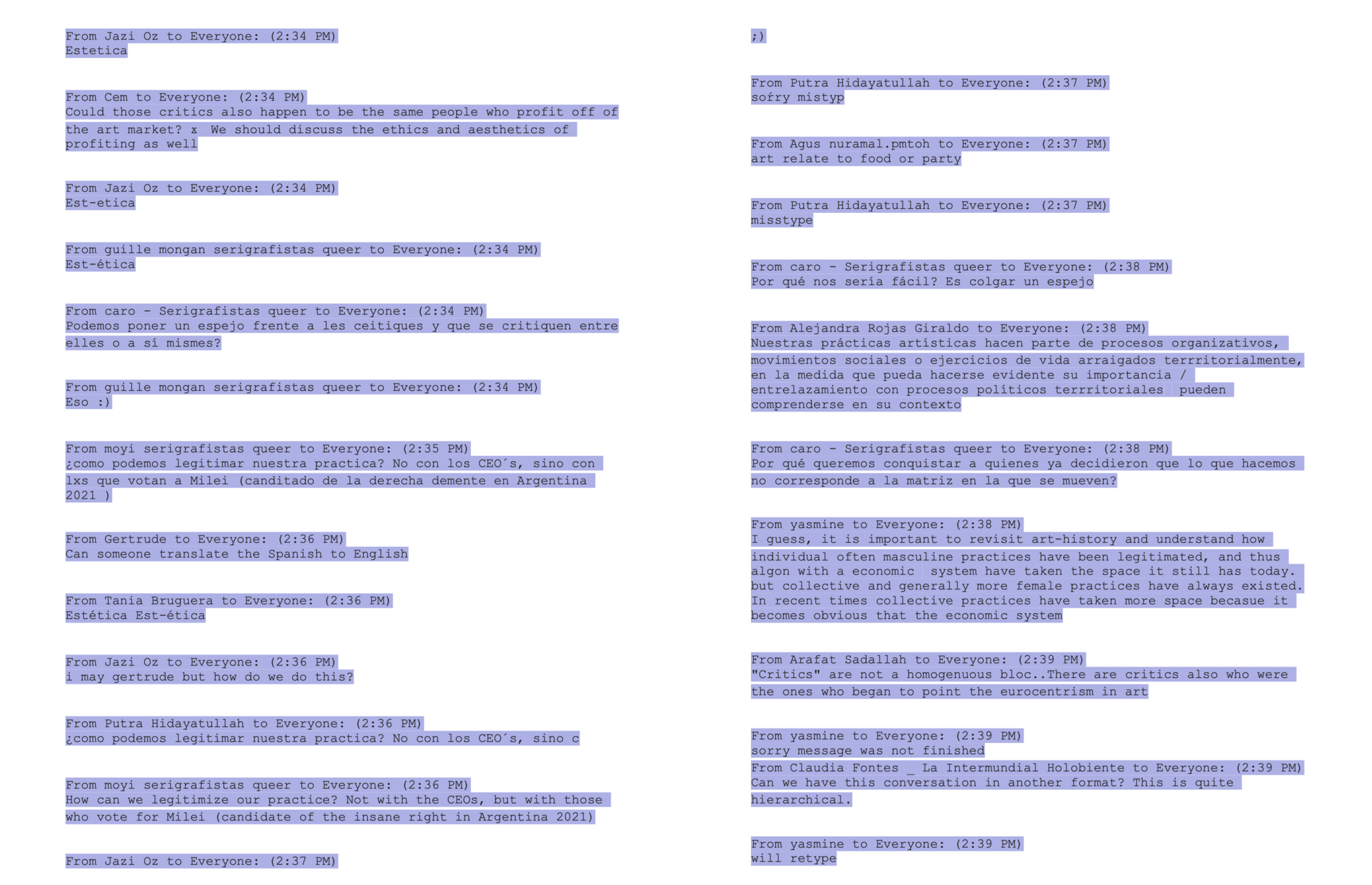 *Where is the Art? was an internal research and discussion group for Lumbung members initiated by the Artistic Team of documenta fifteen during the preliminary research stage in 2021. Different collectives and group members could sign up according to their interests. Periodic sessions and discussions were held and harvested for a number of months, bringing Lumbung members together and allowing them to initiate discussions. The title of the group is somewhat parodical: it refers to an experience which is shared by most Lumbung members, where, because of the collective, and often immaterial nature of our practices, their artistic value is routinely questioned. The conversations generated a fertile ground for contextualising the different artistic practices and began to generate exchanges where we could think about these questions together.