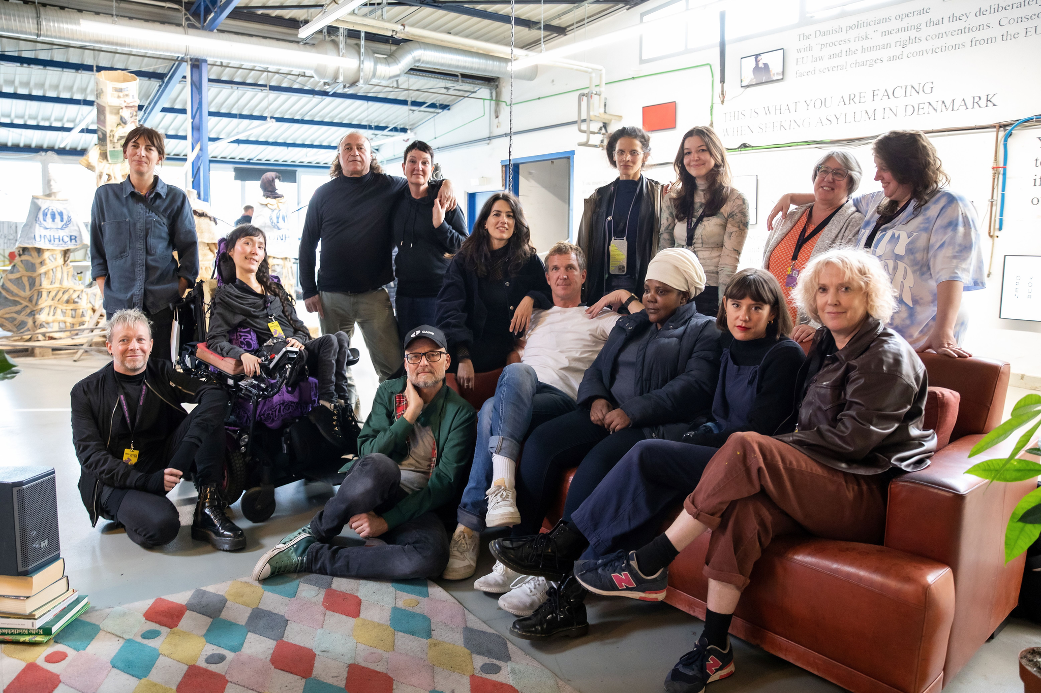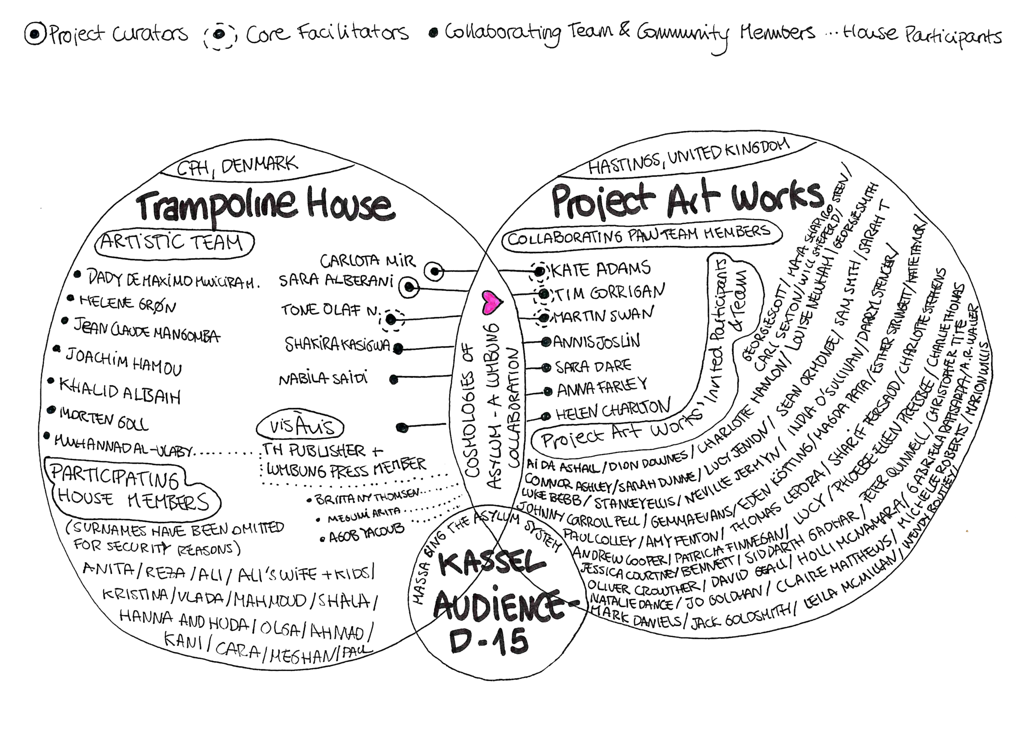 We were able to propose, initiate and develop this collaboration thanks to the openness of our teams and communities, the support of the Lumbung inter-lokal* network and its practices of resource sharing. Massaging the Asylum System couldn’t have happened without the support of Trampoline House co-founder and curator Tone Olaf Nielsen and the close collaboration of Project Art Works artists Kate Adams, Tim Corrigan, and Martin Swan. It also couldn’t have happened without the input of people in Trampoline House and the support of the Project Art Works community. In short, this is a collective venture.