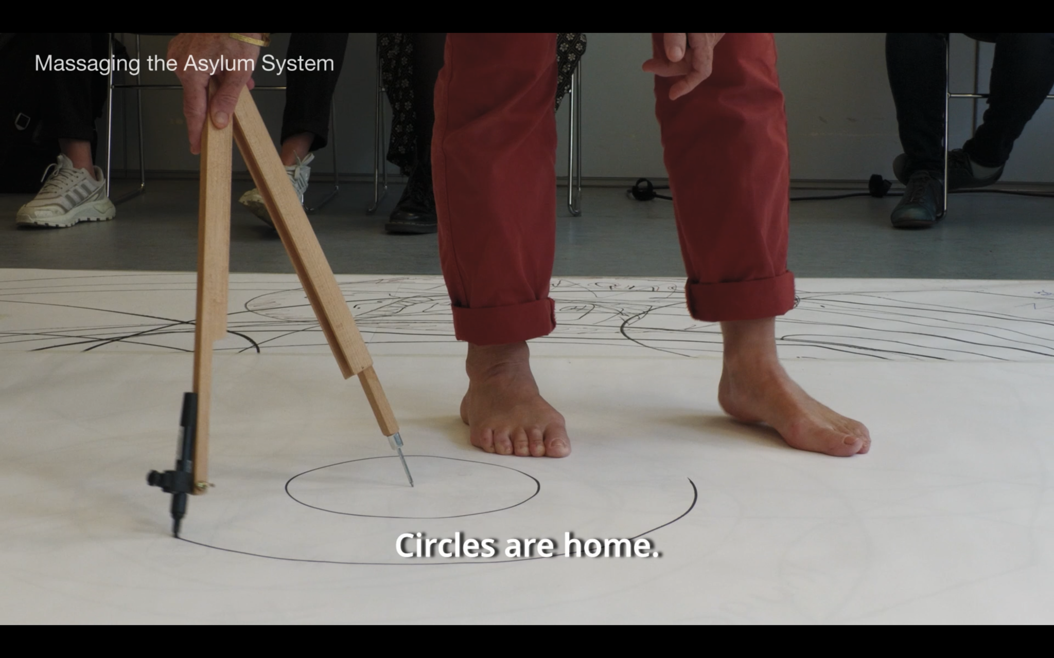 These intersections had other limitations: it is not coincidental that, to our knowledge, there are practically no openly disabled or neurodivergent people who are members of Trampoline House. From the start, Project Art Works were curious about the presence of these communities in the House. As we concluded, people with disabilities, old age and complex support needs in the asylum system are kept in camps in Jutland (another island three hours north-west of Copenhagen) in conditions of severe isolation - and that is if they make it to Denmark at all, as disabled people are much less likely to migrate in the first place.17 Sadly, through the years, Trampoline House has not had the means to bring people from Jutland into the House, as a result of added economic difficulty to engage people who need specific care and support. In the individual cases of House members where disability is a result of the trauma suffered during the migration journey - sadly, a common reality for many people - we didn’t find an appropriate means to discuss the topic in a way that the story could move from the personal to the systemic without exposing the person. In other words, we didn't want to force the intersection of these two realities by concentrating on individual stories. Instead, we chose to focus on establishing parallels between our communities, coming together, and translating aspects of Project Art Works’ methodology into the House dynamics to read the asylum system together and focus on creating solidarity through the joint act of ‘massaging’.