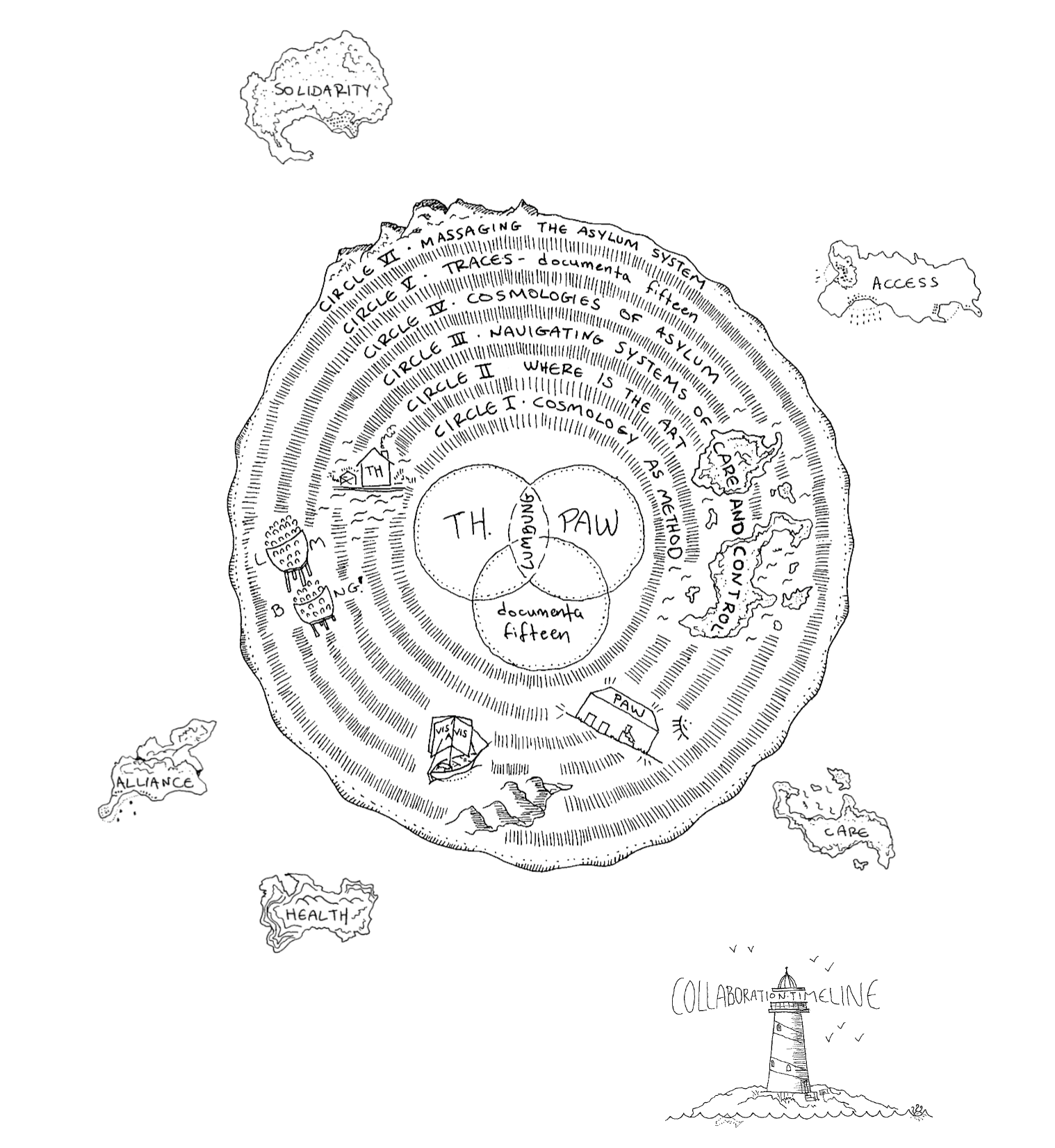 Around the circular drawings, several clickable islands represent the dichotomies and ongoing tensions that our work and communities move between: care/control, alliance/division, health/illness, solidarity/hostility, access/invisibility. Collecting visual materials and citations from Project Art Works and Trampoline House artists, activists, and community members, alongside other authors and their theoretical approaches to the themes that emerged in the collaboration, these islands work as an open-ended, alternative bibliography of the project.