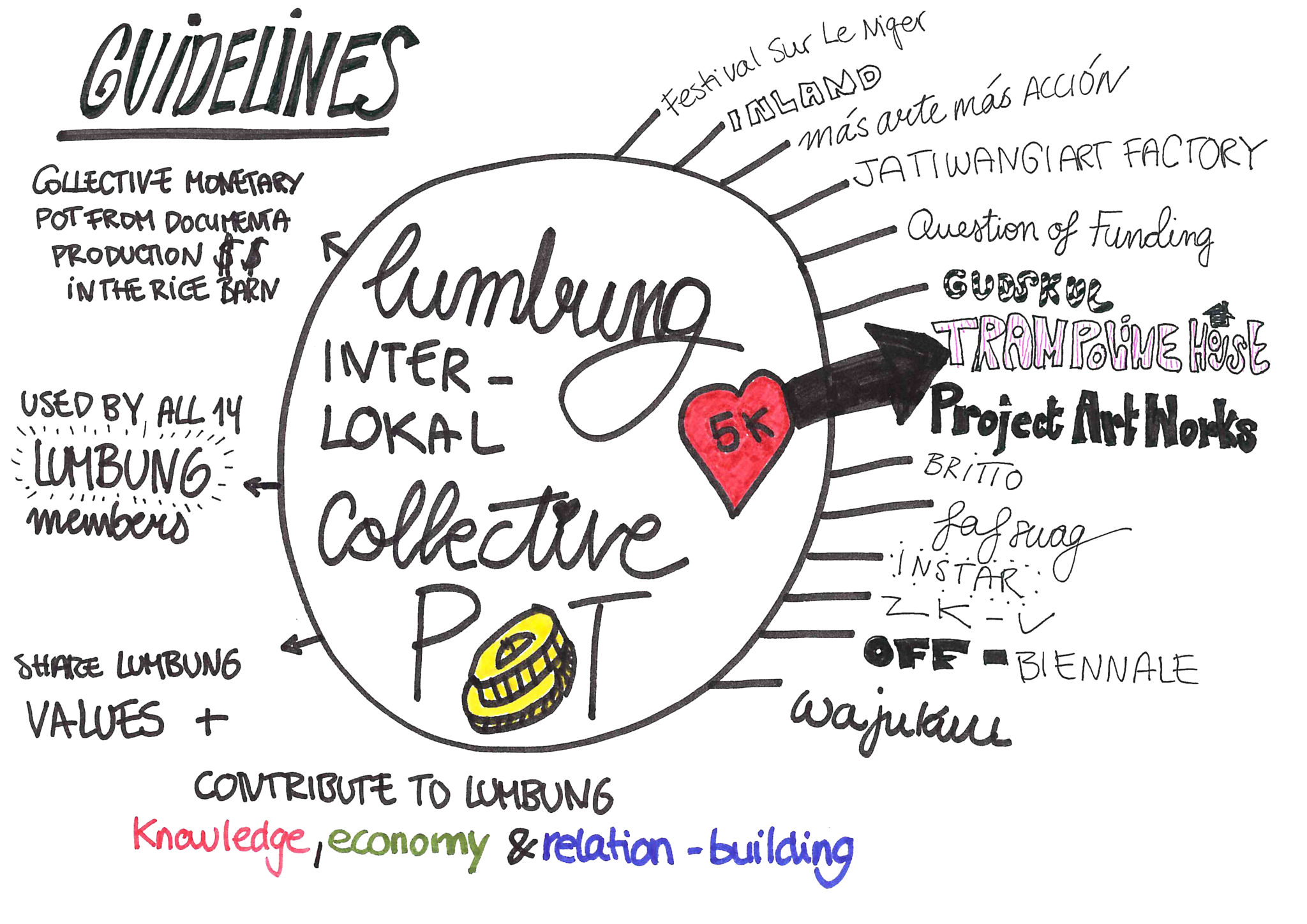 *Collective Pot. The Collective Pot is an infrastructure that was proposed by ruangrupa to all fourteen Lumbung members and artists. It is vessel for sharing money and non-monetary resources such as skills, space, time, and energy, and a shared budget to be governed collectively. It is like a totem pole, something highly symbolic that holds the community together. Thanks to the Collective Pot, projects benefiting the lumbung community were collectively approved and funded. Its aims were: