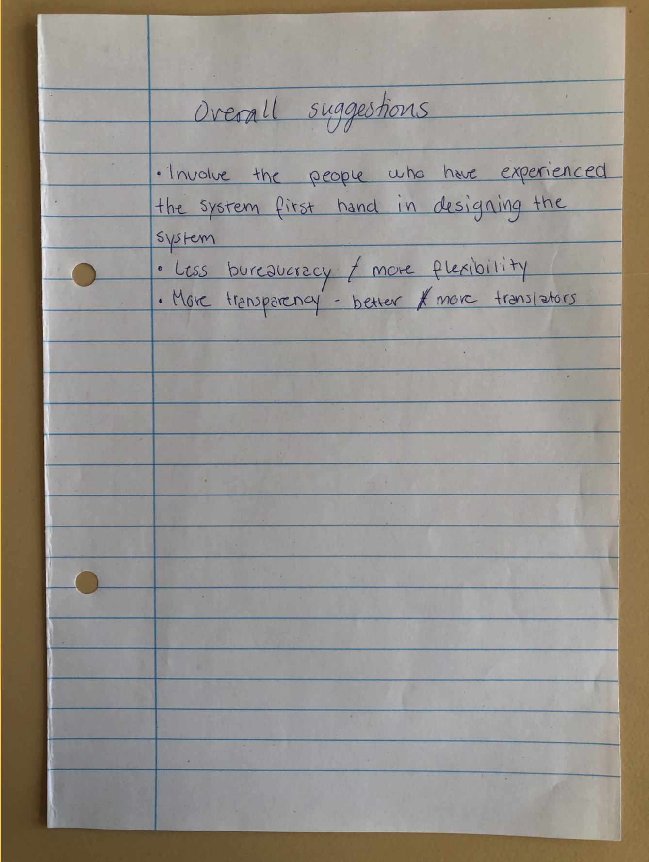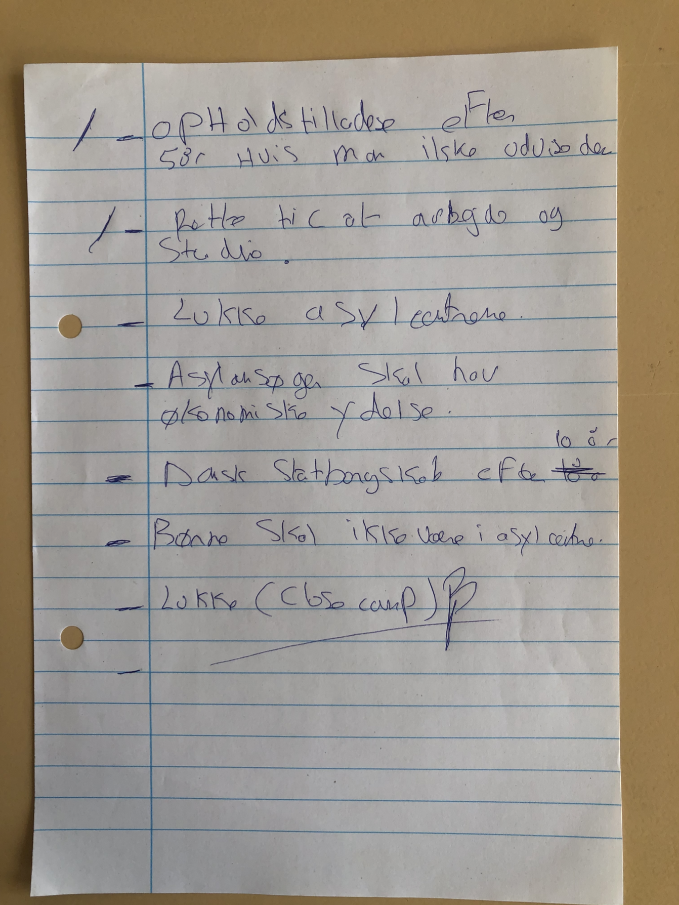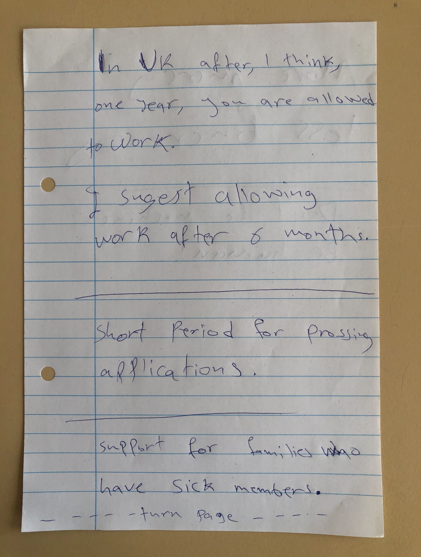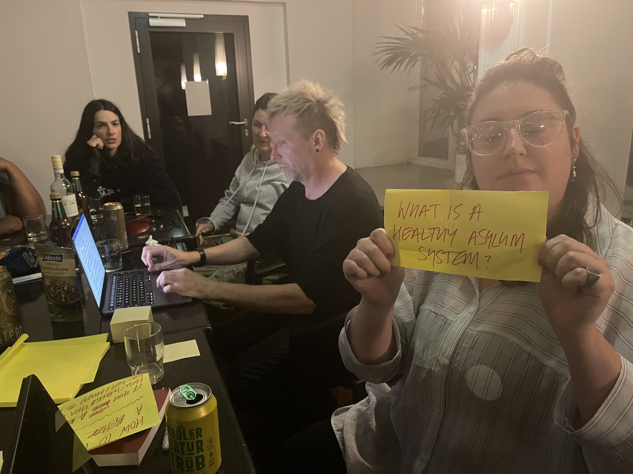 As Sara has written down in her notebook for the day, the question we had before September was: ‘how to inhabit an exhibition space? How do we interact with our communities and documenta audiences in a meaningful way? How can we translate processes that have been born and developed inside specific emotional and physical spaces into the context of a mass-scale exhibition like documenta? In short, how do we translate, and not extract?’ With Kate’s absence, which adds up to an absence we already knew we would have to work with - that of the people from the house, who have all the knowledge and the experience to ignite Kassel, but they can’t leave the country - the translation of our joint endeavour into the exhibition space is a double challenge. Not only do we have to translate people’s voices and concerns into the exhibition space - for that, we have video, a pile of recommendations for a better asylum system coming from house users with migration experience; and we have Shakira as a facilitator, with her experience in the camps, her powerful presence and her piercing voice, along with whomever else might join us today. Now, we also have to translate the cosmologies - a methodology that is collective but that stems from a person's life and artistic vision on struggles shared with many others - into a totally collective enterprise.