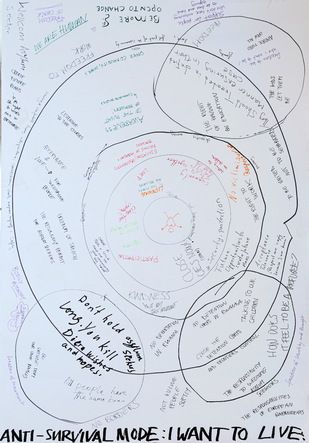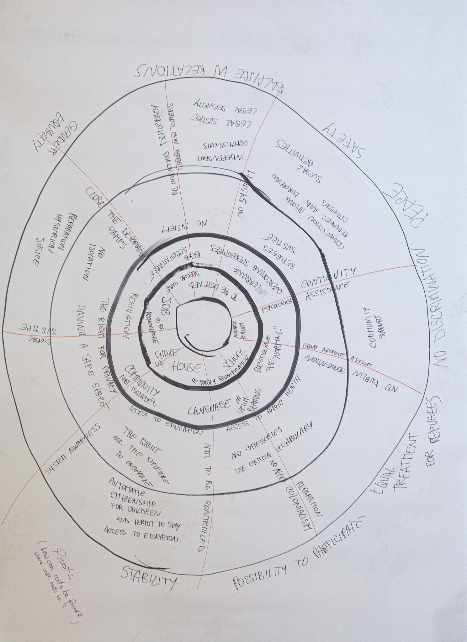 Kate couldn’t join us this time, as she’s had to stay in the UK to take care of a loved one and provide support. The news that Kate couldn’t make it to Kassel for the documenta finissage and our last workshops came late and were pretty hard on her but also on all of us - obviously, we had all been looking forward to sharing this time together, but not only that: the Cosmologies are diagrams that were born out of Kate’s life. Somehow, running the workshop without her is both an act of trust and a leap of faith on her part, and a big responsibility for the rest of us. In the May workshops, she was a vital facilitator in the process of generating a collective dialogue to talk about asylum, people, freedom, build relationships and create something bigger than the sum of its parts. This time though, her absence means that we will be lacking a reference point in the room. Suddenly, the cameraman will have to become a mediator, the curators artists, the activists presenters, the project manager a facilitator, the artists chefs, and the audience activists and artists. I can see some colleagues who are not used to speaking in public pacing around the room reading and memorising scripts, looking terrified.