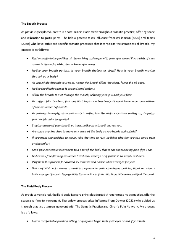 Additionally, as a practice researcher actively embodying somatic principles in line with wellbeing, pain management, and the lived experience, another layer to the practical process was creating several somatic processes in reflection to the initial movement films and principles explored in phase 1. As these movement films were influenced by existing practitioners, professionals, and pioneers from the field, it was imperative to draw upon the practice of others to inform the somatic processes created as a response. The specific somatic principles explored were: