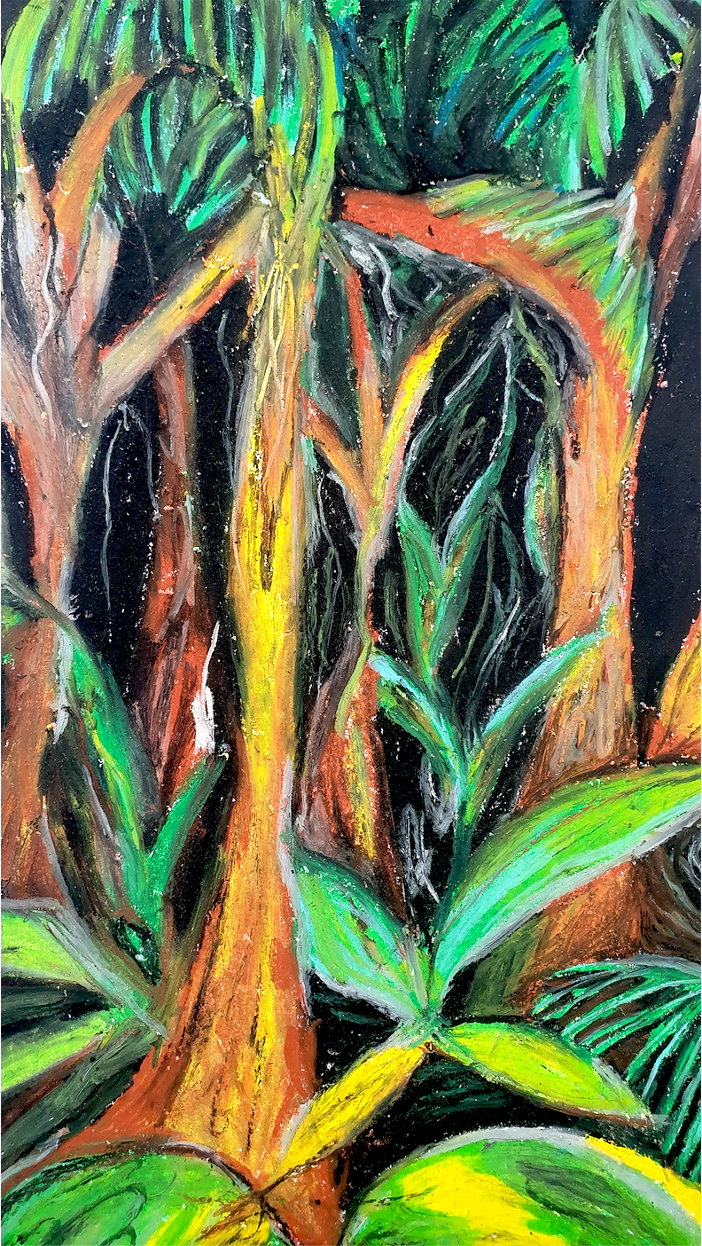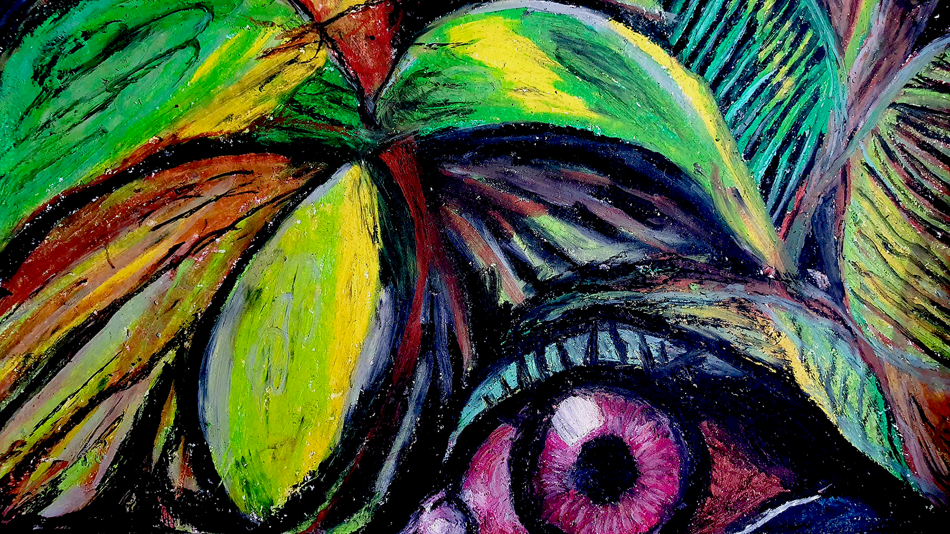 IMAGE DESCRIPTION: Oil crayon illustration with rich, vibrant colours depicting a close up perspective of a single disembodied, bloodshot eye peering out of thick rainforest foliage.