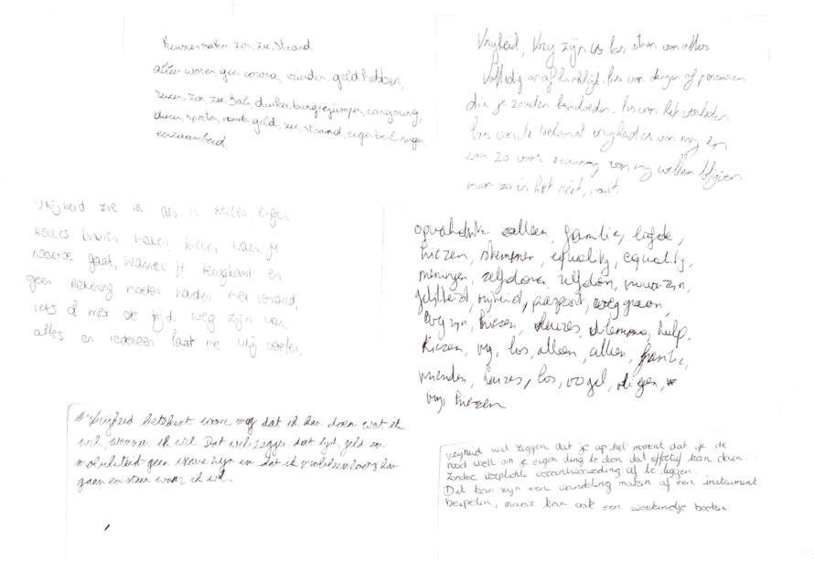 Voor het gesprek rond vrijheid van start ging, schreven de deelnemers zonder voorbereiding een korte tekst over wat vrijheid voor hen betekent. Deze teksten zijn hieronder terug te vinden.
