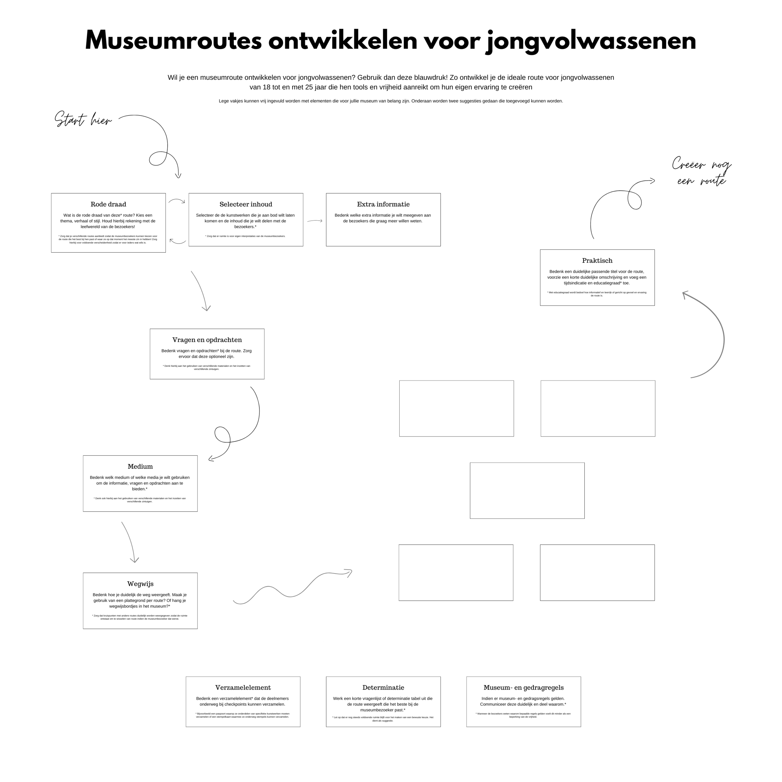 De bevindingen van dit onderzoek worden vastgelegd in een blauwdruk dat gebruikt kan worden door publieks- en educatiemedewerkers van musea voor het uitwerken van routes voor jongvolwassenen die vrijheid bieden tijdens het museumbezoek. Deze blauwdruk is hiernaast terug te vinden.