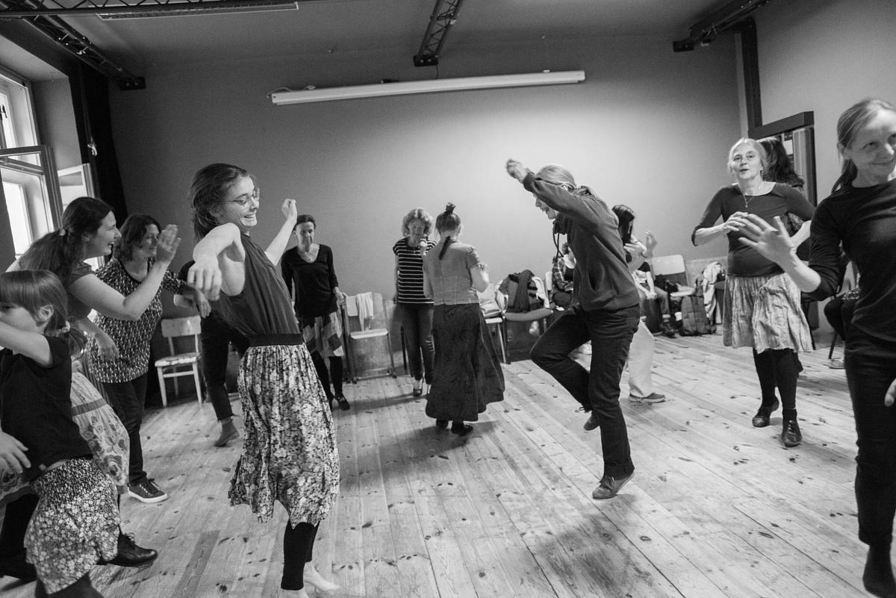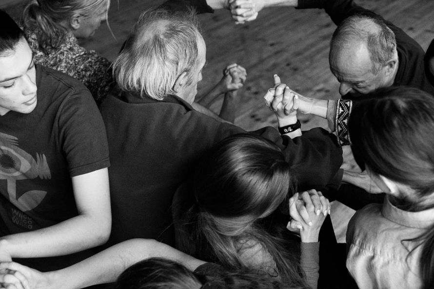 Theatre Węgajty who took part on the project finds the aspect of shared experience and meeting as one of the key points of their work. According to them it is beneficial when the group is diverse and both people who are able to interpret classical compositions and those who have experience with folklore and archaic vocal techniques, amateurs and professionals come together. Therefore, they taught the group the old canons, whose repetitive character, according to them, brings the community together – for example canons of Matthew Locke, Joseph Haydn, Augustin Kubizek or traditional sutartinės from Lithuania. “The canon is something on the borderline between classical compositional music and traditional song associated with oral tradition and anonymous production. This convention has often been adopted by great, ‘non-anonymous’ composers. It can be said that the canon composed as a short, easy-to-remember form, which makes it possible to move away from the score, moves into the realm of oral tradition” (Wacław Sobaszek 2023: 42, author’s translation). This convention of the canon is regarded by the Sobaszeks as a kind of unifying element.