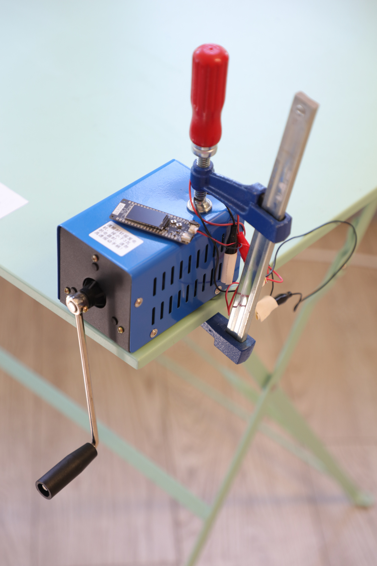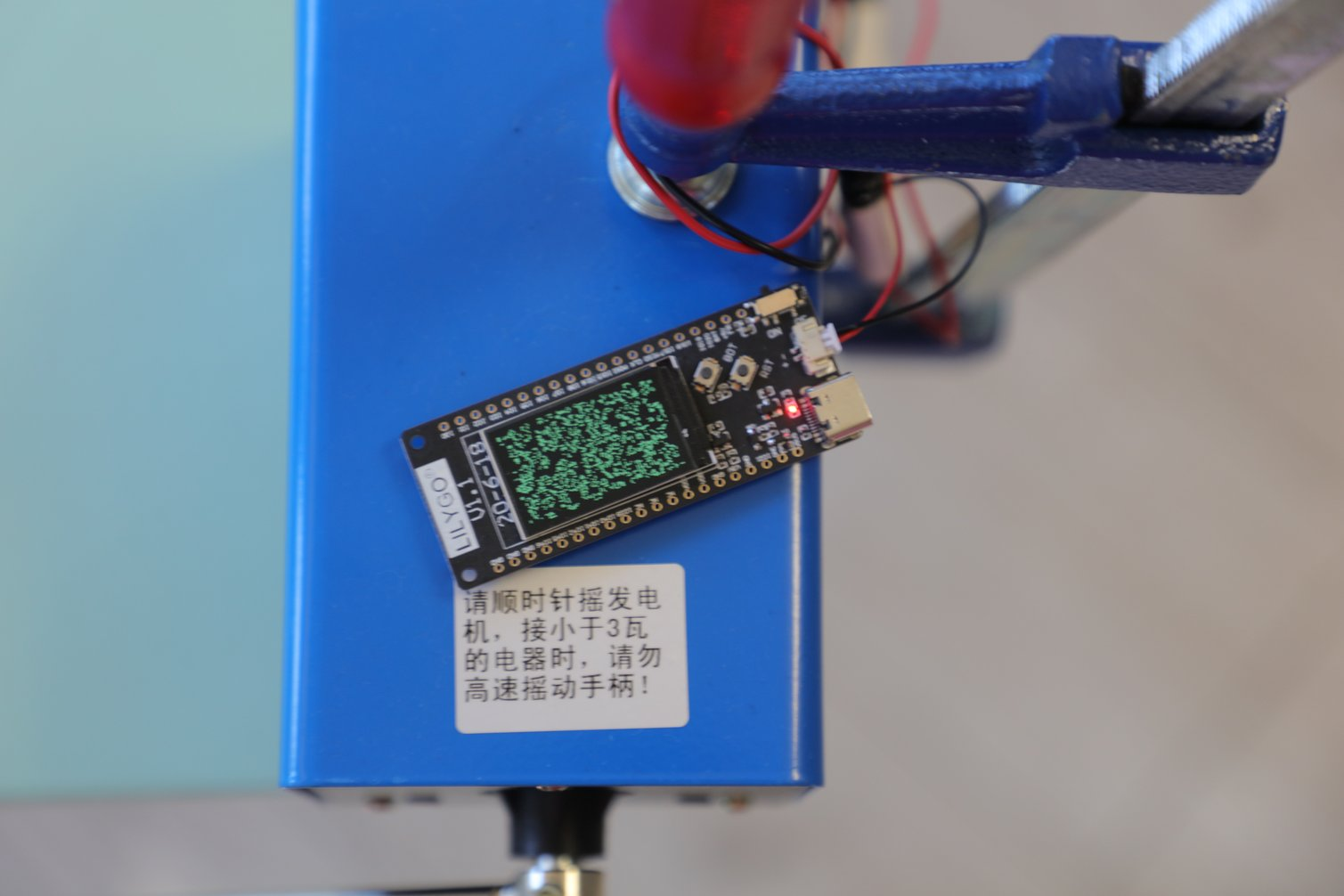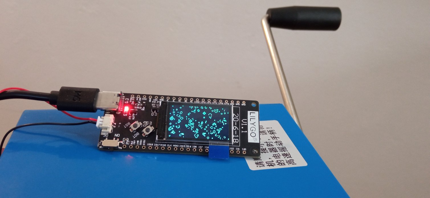 My installment of the game of life also uses the low energy chips used in Photosynthesis, except with a faster display that needs constant energy. To put the system in motion, the visitor must activate a hand cranked dynamo. Life in the small screen will evolve as long as the crank is in movement. Every time it stops and starts again, a new random initial configuration is created, which in turn evolves into infinite possibilities.