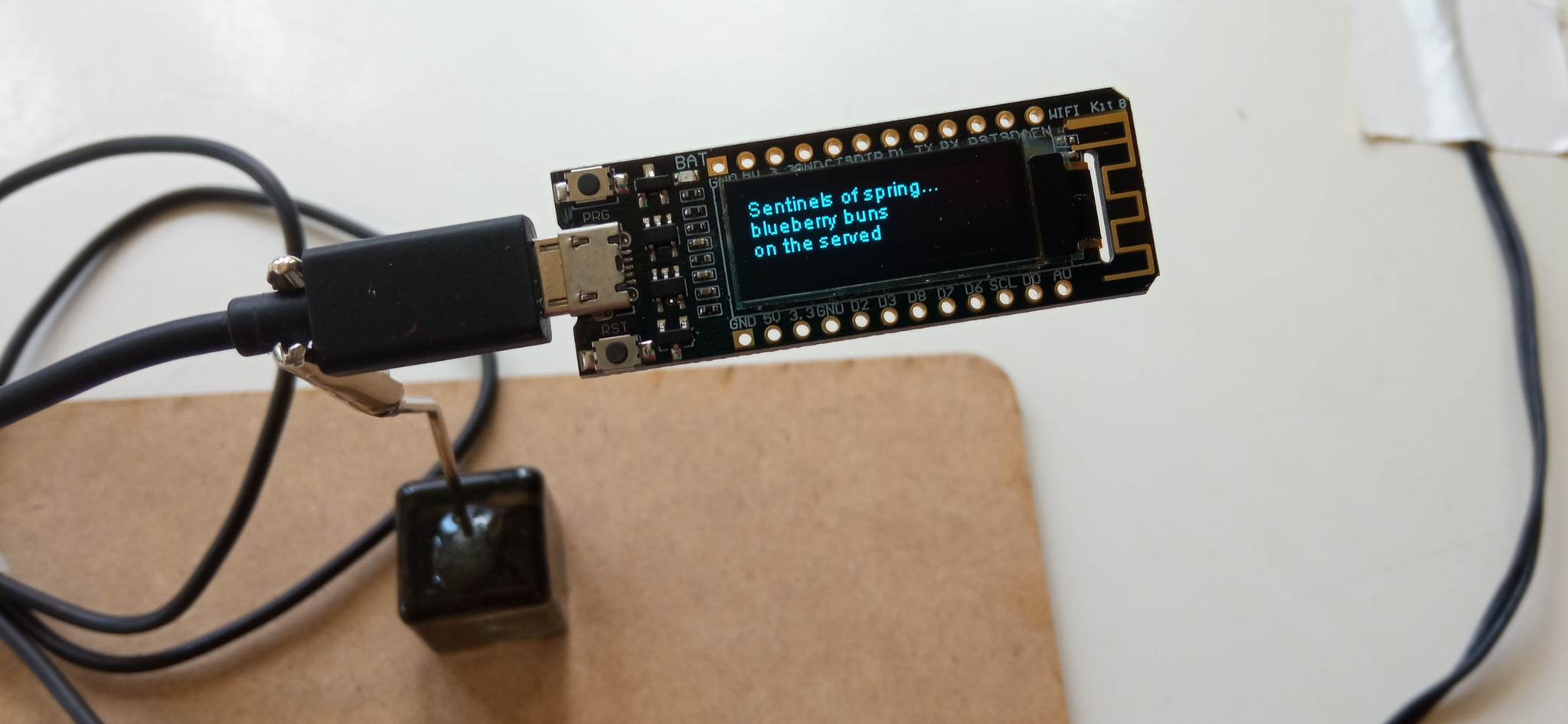 The software downloads a picture and makes an inference on it that is most likely to be flawed: the Google dataset used has the capacity to recognize only 90 different things. The pictures and results are displayed on a small screen. These mistaken inferences are then fed into another AI, which uses the words as a prompt to create haikus. The nonsensical poems are finally displayed in another micro display.