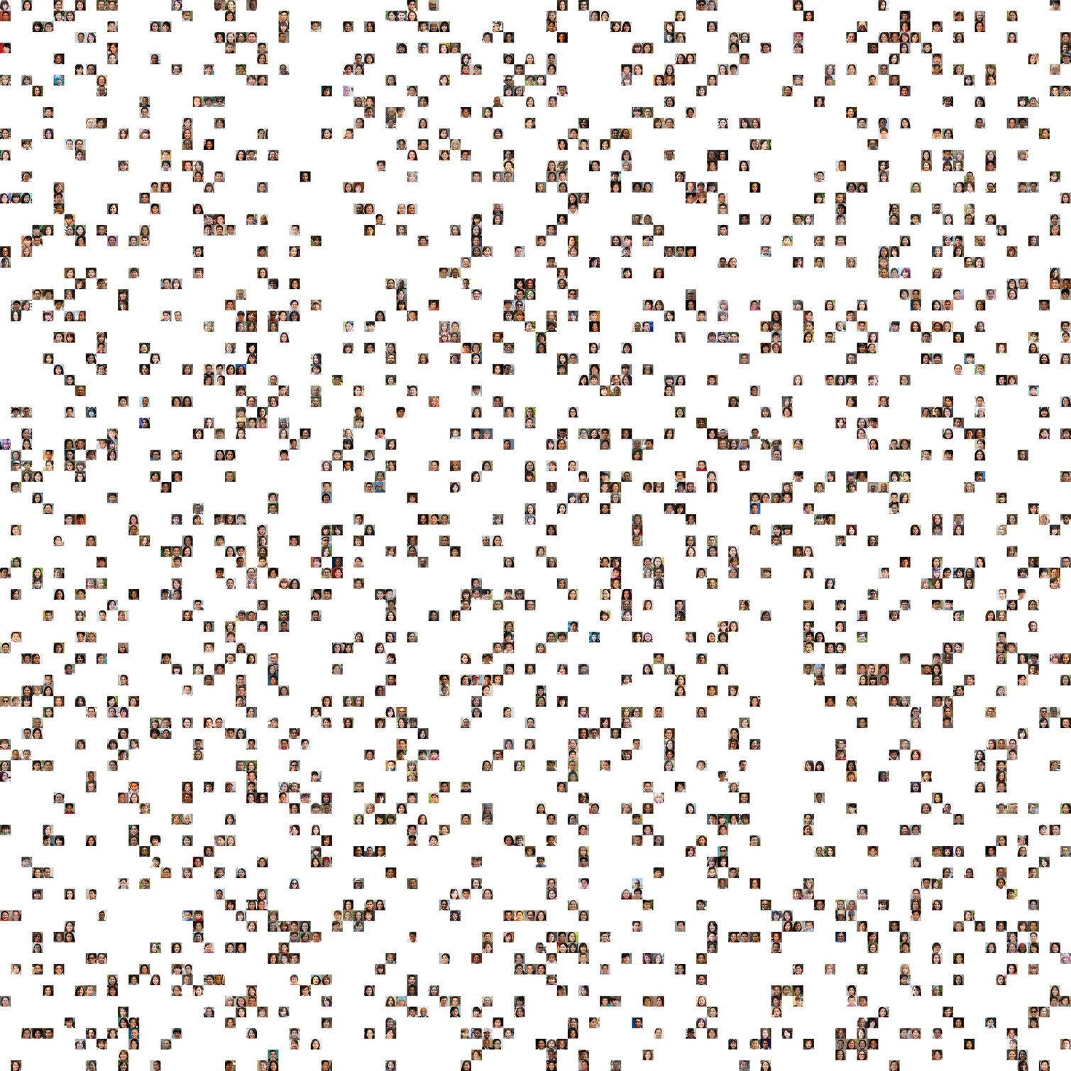 Faced with those concerns, I decided to add the third element of the piece. In this last one, I did the selection of non-white faces manually. This allowed me to reflect on the subjectivity and criteria that such a task entails. Ethnicity is not just a visual feature: I weighed my decisions on factors I did not suspect, such as what I evaluated to be the wealth of the subject. Even though I might have corrected what I considered to be errors of the ethnicity algorithm, I certainly have brought my own flaws into play. It also allowed me to compare manual labor against machine labor. The task took me about 16 hours to complete, considering I had to go through 10.000 faces, and that I might have spent a long time on a few ones which were more undefined for my own subjectivity. The automated process, in comparison, took just a couple of minutes.