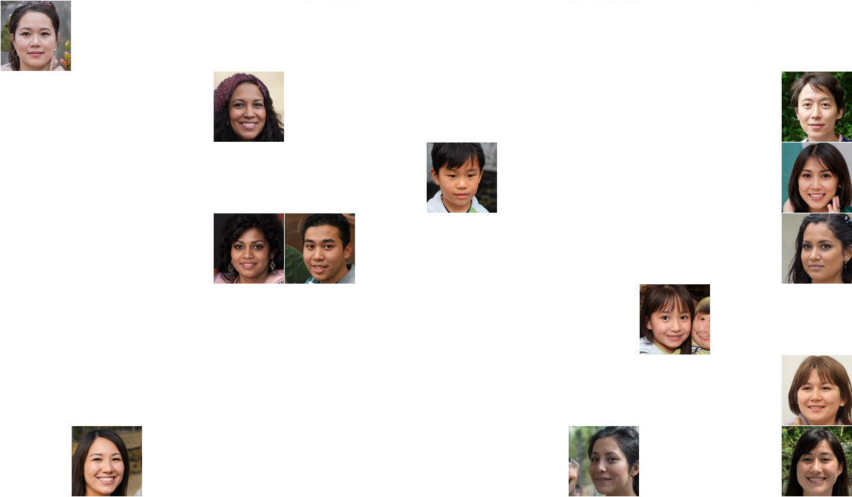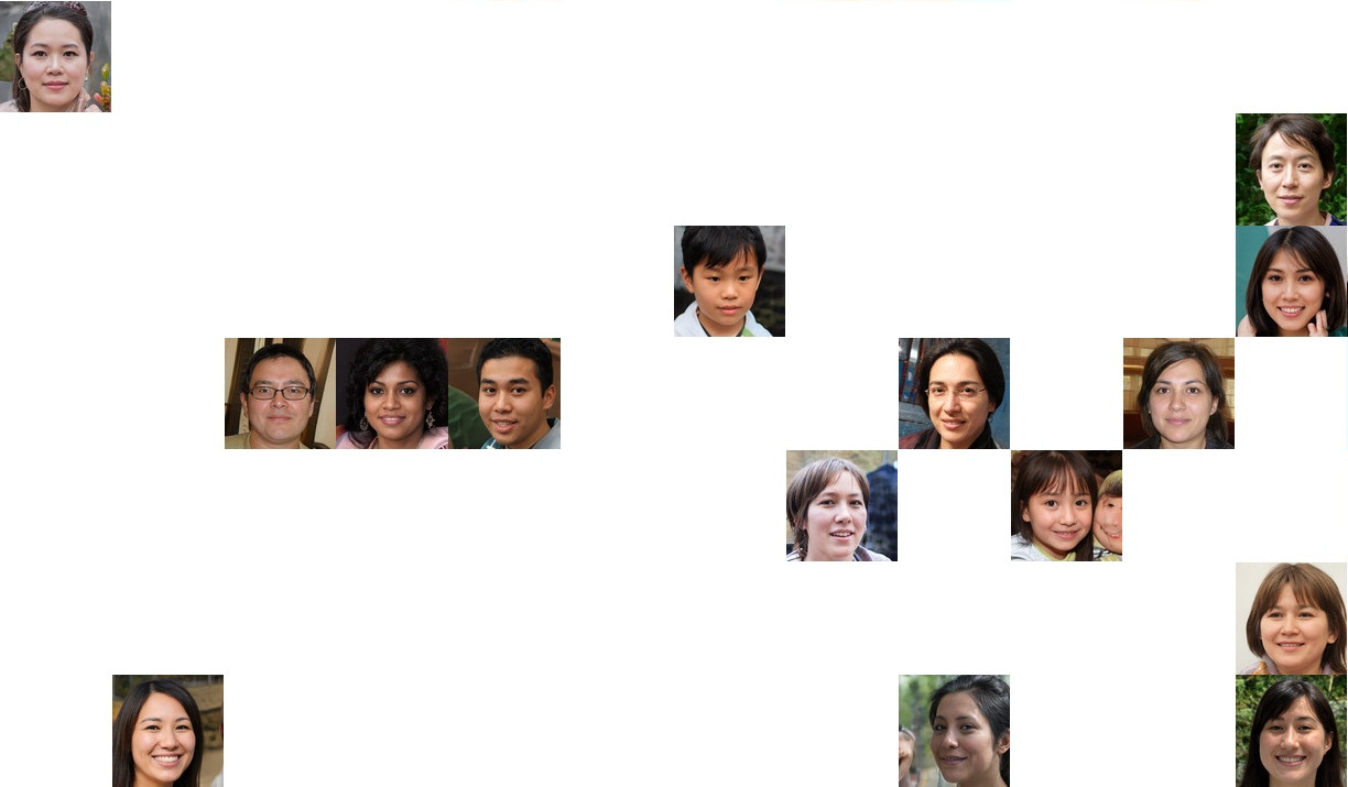 In order to generate new images, this platform requires a great number of images to be trained on - in the orders of thousands (although artistic projects might sacrifice quality for creativity and use just a few hundred images to train). Training is a computing-expensive process, which is usually done in the research centers. The graphics cards company NVidia – where the current version of StyleGAN2 is being developed – offers a few pre-trained models for experimentation. Probably the most popular of them is based on the Flickr faces dataset.1 This collection of face images was created by scraping the Flickr website. Images with permissive licences were downloaded and cleaned up to arrive at a total of 70.000 1024x1024 pictures of faces. Even though the creators of the site claim that it “contains considerable variation in terms of (..) ethnicity”, its distribution is clearly biased towards caucasian people.