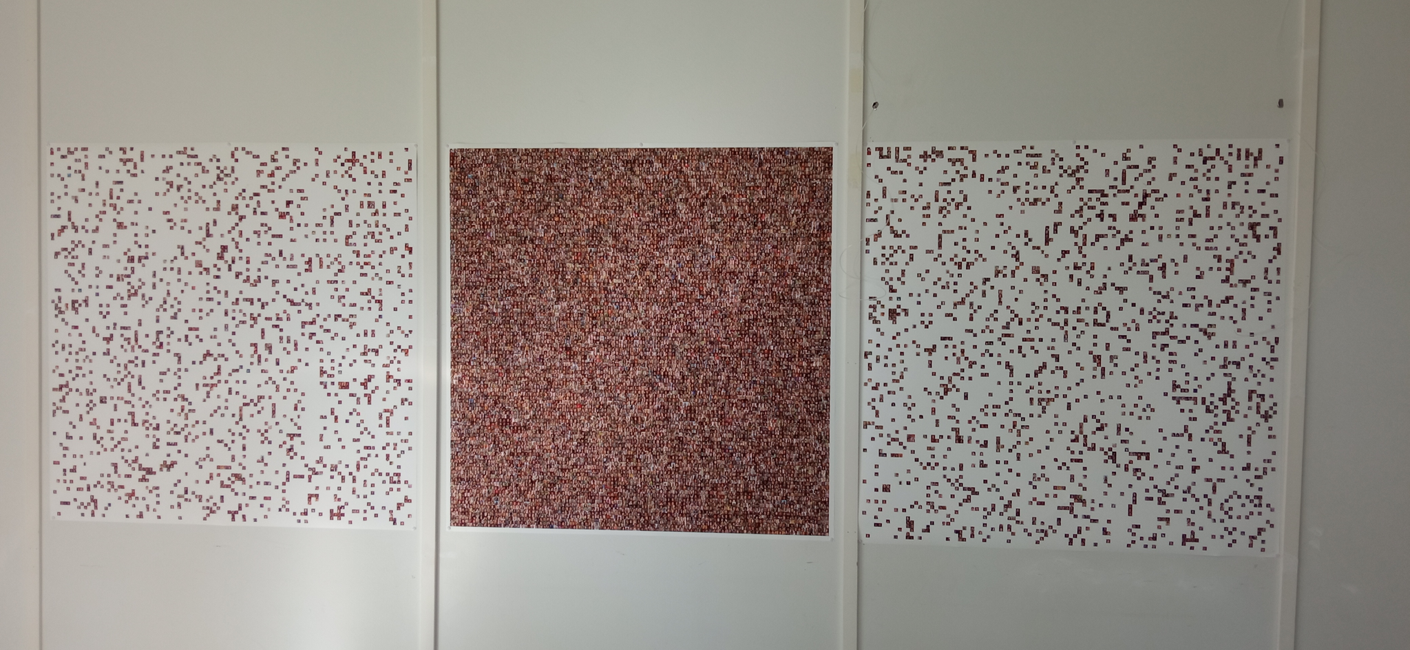 In order to make this bias visible, I ran another artificial intelligence algorithm – perhaps just as problematic as the dataset – that proposes to classify human faces according to ethnicity. Using it as a base, I wrote a software that erases all the caucasian faces from the same grid created before, creating empty spaces and therefore leaving only non-white people. This is the piece on the left side of the tryptic. As one could expect the result of the effacement is also highly questionable. The program does a terrible job, leaving persons who are clearly white, while erasing faces of non-western people. It should be said, in any case, that the software used is not professional or peer-reviewed. In fact, most of the companies which offered such services stopped offering them due to the obvious controversy of the possible uses of such a tool.