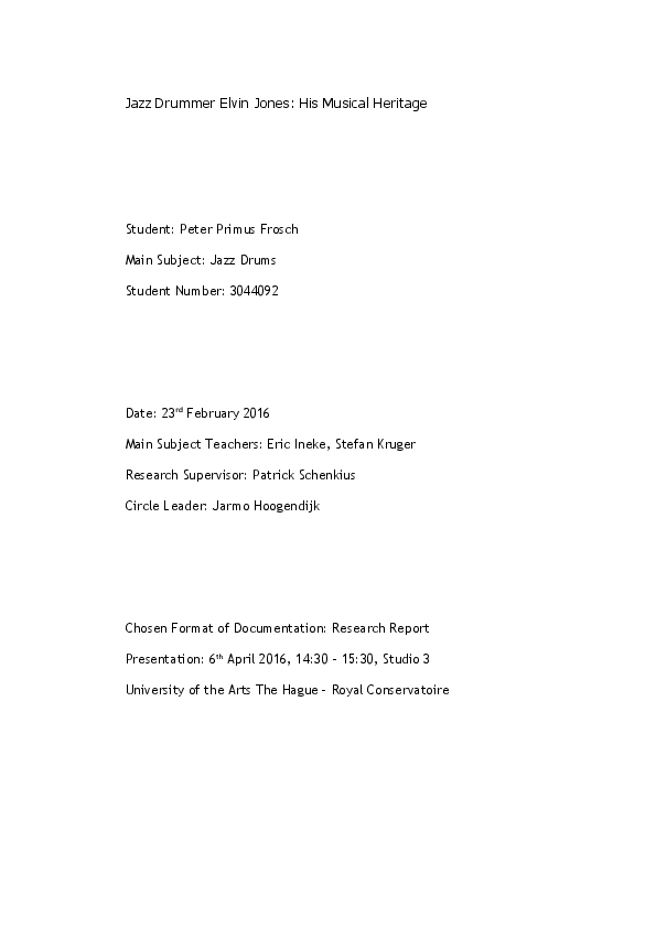 Abstract Name: Peter Primus Frosch Main Subject: Jazz Drums Research supervisor: Patrick Schenkius Title of Research: Jazz Drummer Elvin Jones – His Musical Heritage Research Question: What are the methods of Elvin Jones' playing and how did famous jazz drummers deal with his heritage? Summary of Results: The American jazz drummer Elvin Jones is one of the most famous musicians in jazz history. Nevertheless due to the writers' lack of ability to play the drums the existing research is very unsatisfying from a jazz drummer's perspective. Based on a wide array of transcriptions I put together several methods and concepts for accompaniment as well as drum solos developed by Elvin Jones. I also identified two predecessors to specfic stylistic approaches. The second chapter is about Jack Dejohnette, Jeff 'Tain' Watts and Brian Blade and how they dealt with his heritage. My main conclusion is that aspects of Elvin's style especially the method of 'play the drum set as one instrument' completely changed the approach of playing the drums in Jazz. Specific characteristics can be found in the better part of contemporary jazz drummers and therefore it is essential to deal with his concepts and ideas. This research helped me to increase my awareness of various stylistics of modern jazz drum set playing and at the same time I got an idea on how to apply those methods. CV: Peter Primus Frosch (drums) born on the 11.12.1990 He started playing drums at age 5. After school in 2010 he enrolled at the Konservatorium Wien Privatuniversität studying with the likes of Mario Gonzi and Walter Grassmann. Since fall 2014 he is now continuing his master studies at the Royal Conservatory in The Hague, where he is under the guidance of the great dutch jazz drummer Eric Ineke. Awards: Fidelio competition finalist in 2012 and 2013, winner of the audience award in 2012; Most promising award“ by Marianne Mendt Jazznachwuchsförderung; winner of „New faces of Slovak Jazz“ 2014 best drummer at Generations International Jazzfestival Frauenfeld (Switzerland) - Jury: Lewis Nash, Seamus Blake, Don Friedman 2015: Winner of the Herbert Schedlmayer Jazz Stipendium workshops with Louis Hayes, Jimmy Cobb, Lewis Nash, David Hazeltine, Don Friedman, Seamus Blake among others; played with: Roman Schwaller, Clemens Salesny, Stephan Plecher, Jure Pukl, Daniel Nösig, Oliver Kent, Franz Hautzinger, Adrian Mears, Peter Herbert, Reinhard Micko, Klaus Gesing etc.