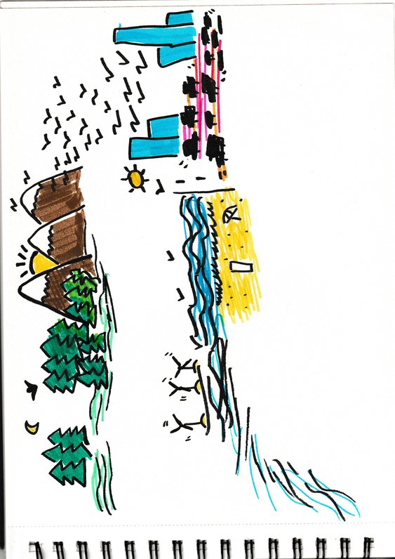 In the next studio session, I came up with the idea of making a soundscape. By playing and improvising, I imagined noises we hear every day around us: the sound of a bush trimming machine, cars honking in city traffic etc. I could think of creating a sound world full of wonder and excitement for the audience to wander in. In the next couple of weeks, I worked on making drawings and a musical score.