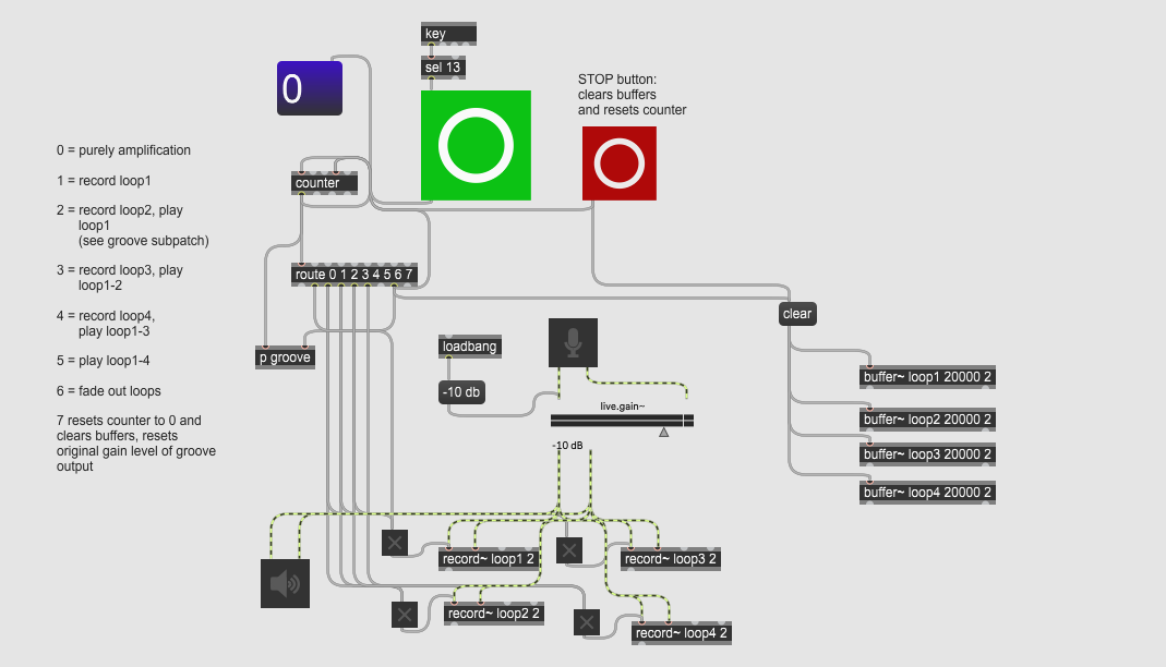 The counter object in MaxMSP is used as the base for my loop station. It notes the amount of times the green button is triggered. The route object will then trigger for each number (0 to 7) the respective actions. The red button will reset everything and clears the buffers for the recorded loops. The green and red button can be mapped to the MIDI ring as well (using the functions of short and sustained "click"), yet in the end I used my Bluetooth page-turn pedal, which does the trick when paired with my PC. Using the pedal was more feasible than clicking the MIDI ring while playing. After all, in one of the modes of this page-turn pedal, it will replace the keyboard's SPACE key for the left and the ENTER (or CR) key for the right wing of the pedal. I connected this right one to the large green button, using the key object in Max with the ASCII code for the ENTER key.