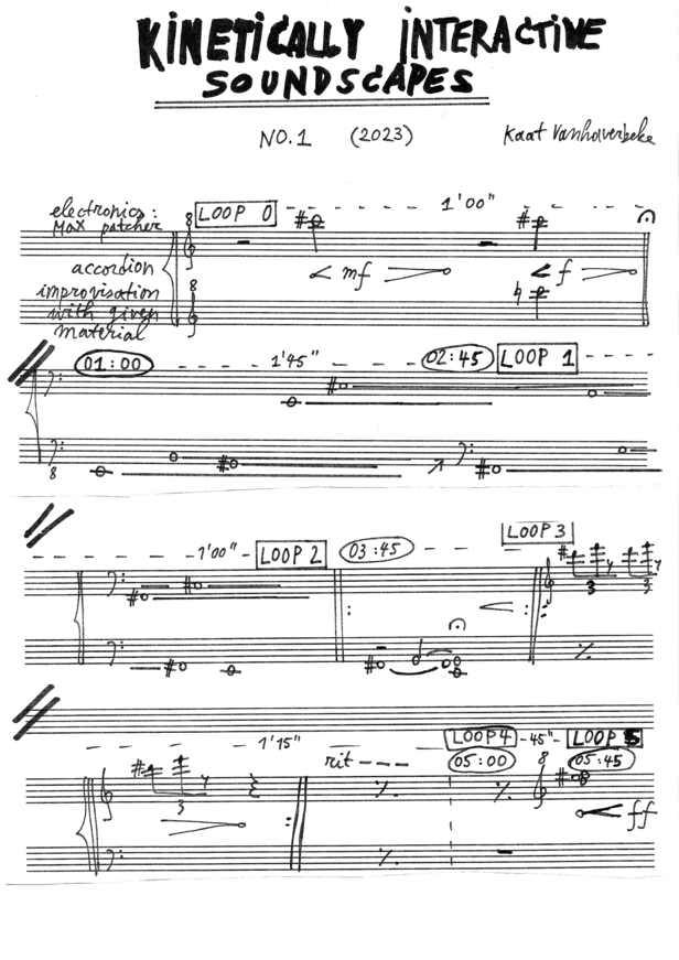 However, soon I began to rethink the initial plan of Contrapunctus: the counterpoint themes that I used were melodically too busy, causing a rather meaningless musical chaos. Furthermore, I couldn't reach a point of subtility and authentic expressiveness within this idea. It is then, while playing and experimenting, that I discovered the recognizability of my almost artificial music. It resembled noises we hear every day around us. I found it at least funny and remarkable that departing from an accordion sound, I could imagine the sound of cars honking in city traffic. In the spirit of keeping options open, I developed my "Kinetically Interactive Soundscapes" further as an improvisation tool.