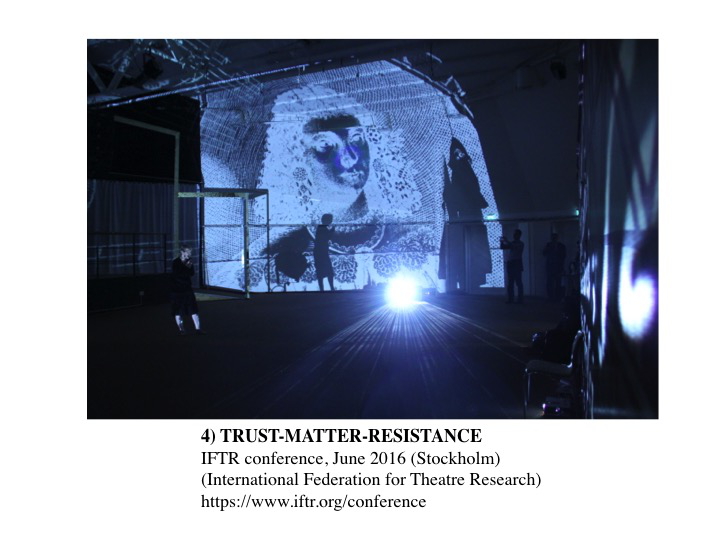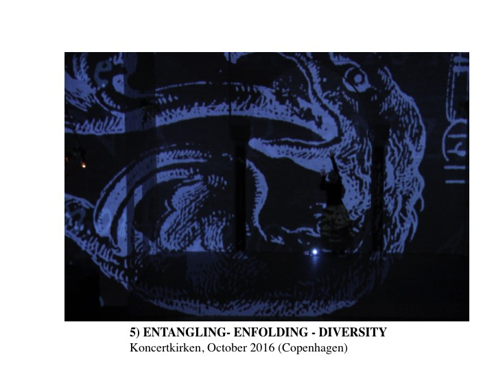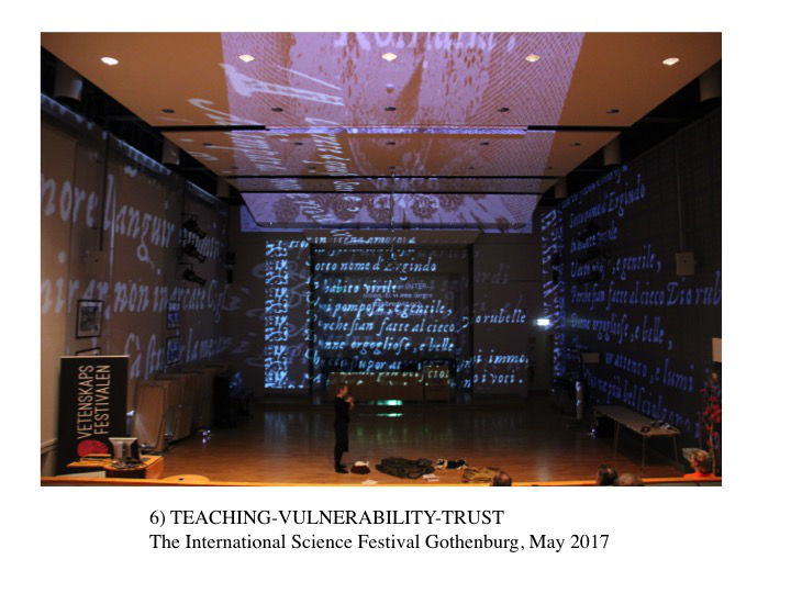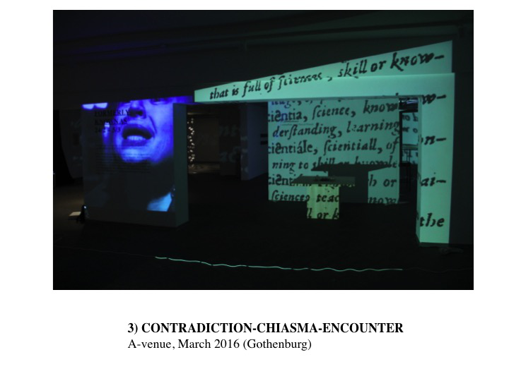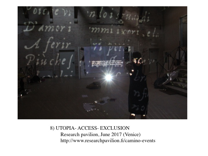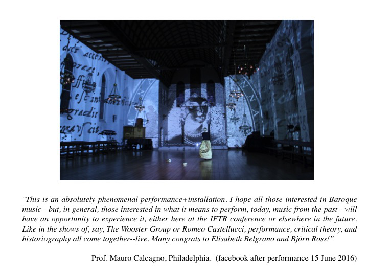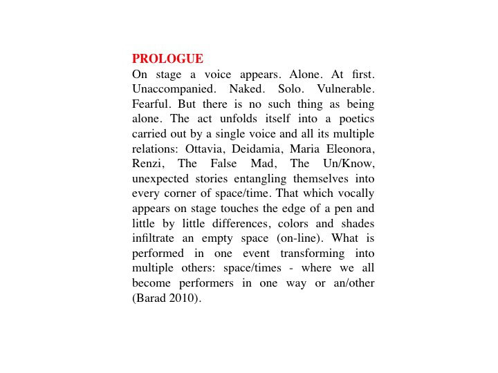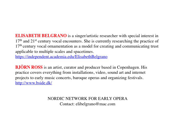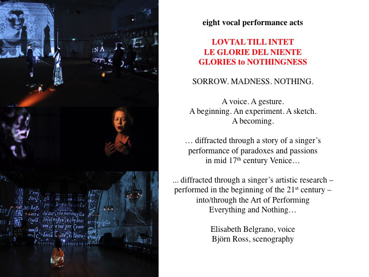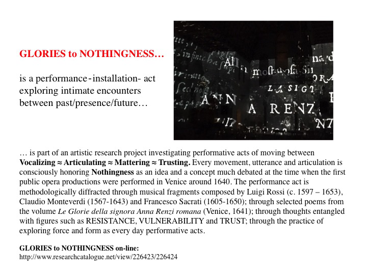 GLORIES TO NOTHINGNESS SORROW. MADNESS. NOTHING. A voice. A gesture. A beginning. An experiment. A sketch. A becoming. ... based on the story of a singer’s performance of paradoxes and passions in 17th century Venice. ... based on a singer’s research – performed in the 21st century – about the Art of Performing Everything and Nothing. GLORIES TO NOTHINGNESS is an artistic research project investigating performative acts of moving between Vocalizing ≈ Articulating ≈ Mattering ≈ Trusting. The research question: How to perform trust? Every movement, utterance, projection and articulation is consciously exploring and honoring Nothingness as an idea and a concept much debated at the time when the first public opera productions were performed in Venice around 1640. Based on a performative research approach and new materialist theories, performance acts are methodologically diffracted through musical fragments composed by Luigi Rossi (c. 1597 – 1653), Claudio Monteverdi (1567-1643) and Francesco Sacrati (1605-1650); through selected poems from the volume Le Glorie della signora Anna Renzi romana (Venice, 1641); through thoughts entangled with figures such as RESISTANCE, VULNERABILITY and TRUST; through the practice of exploring force and form as every day performative acts. Elisabeth Belgrano vocal projections / performance Björn Ross visual projections / scenography